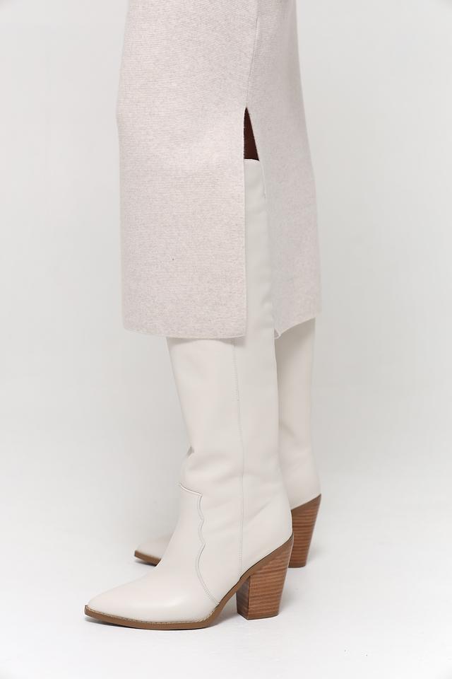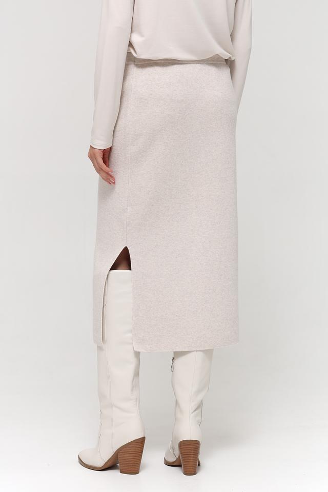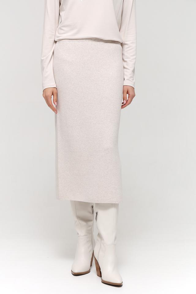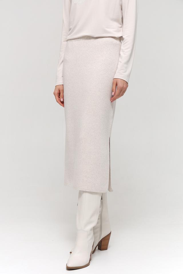 Модель имеет длину миди и приталенный силуэт, который подчеркивает фигуру. Сбоку юбки расположен разрез, добавляющий образу динамичности и легкости. Юбка выполнена в бежевом цвете, который легко сочетается с различными элементами гардероба.