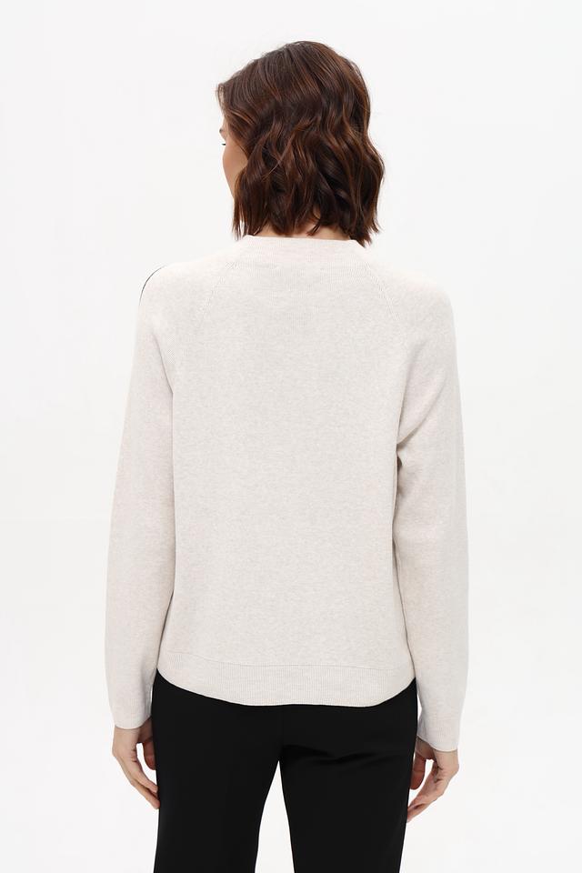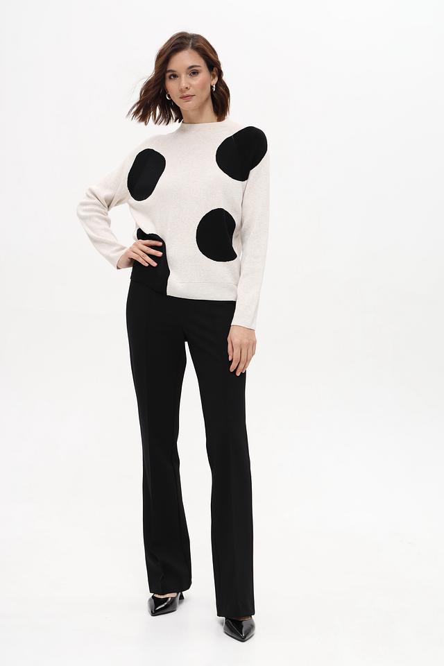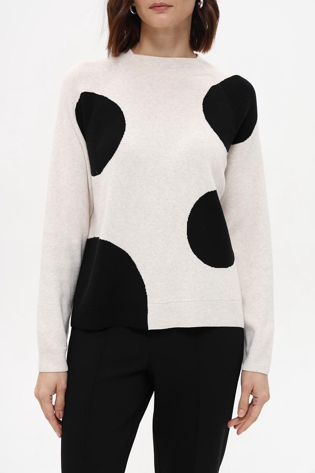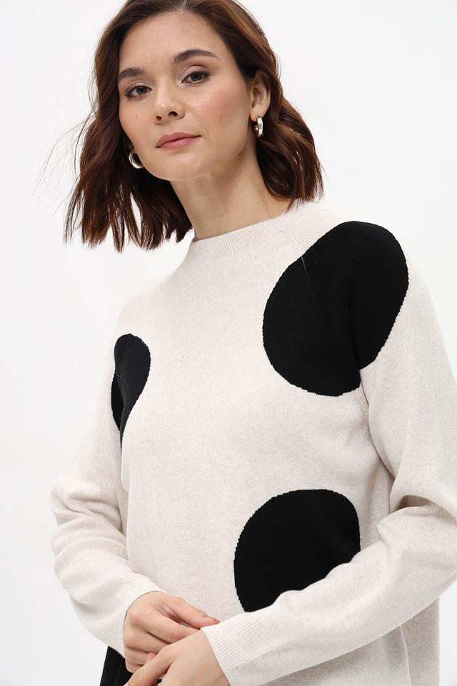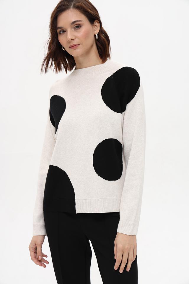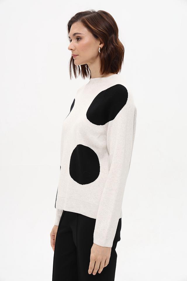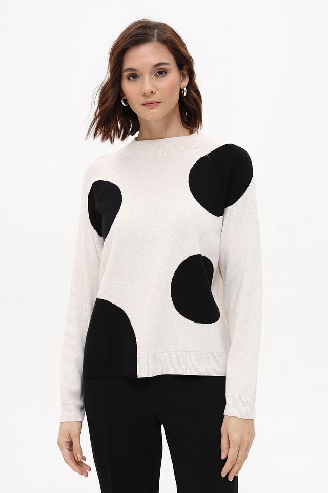Дизайн пуловера отличается оригинальным принтом в виде крупных чёрных горошин на бежевом фоне. Это придает изделию игривый и современный вид. Классический круглый вырез горловины и длинные рукава делают его универсальным для различных образов.