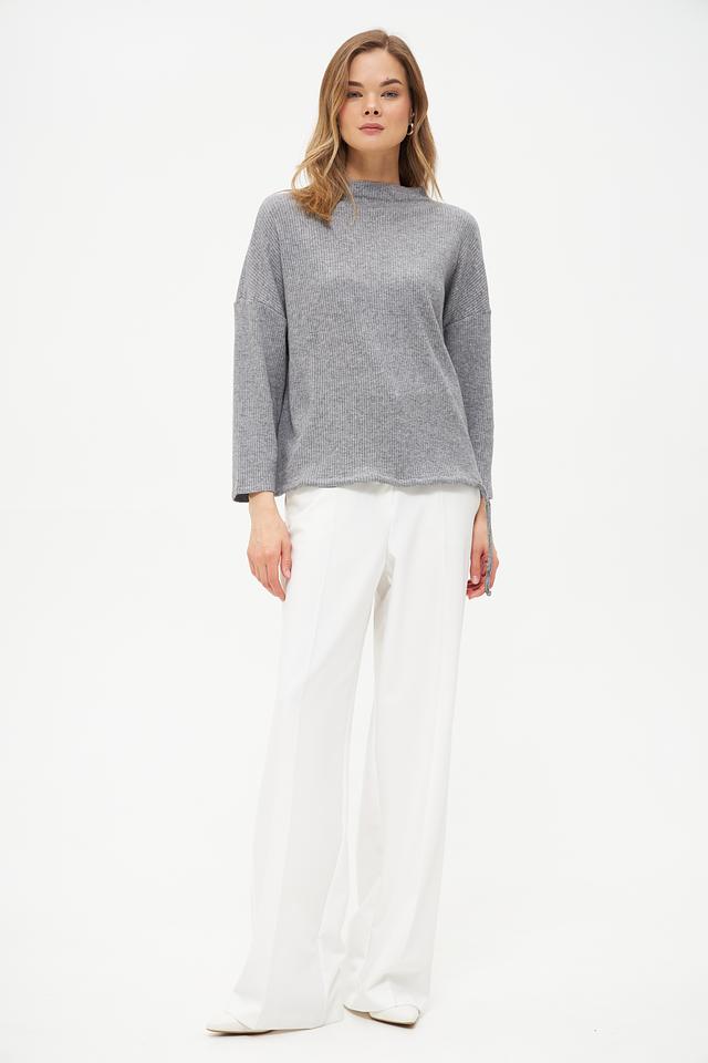 Пуловер имеет серый цвет с выраженной текстурой в рубчик. Вырез горловины выполнен в форме лодочки, что придает образу элегантность. Рукава три четверти делают модель универсальной и подходящей для любого времени года.
