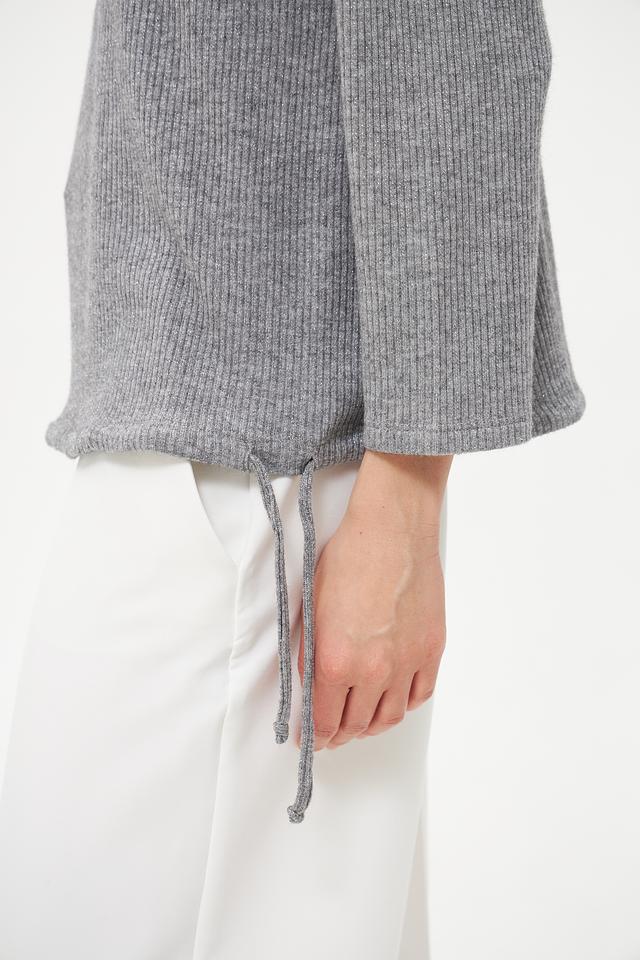 По бокам пуловер оснащен завязками, которые позволяют регулировать силуэт и создавать различные образы. Состав ткани включает вискозу, полиэстер, полиамид и эластан, что обеспечивает хорошую посадку и износостойкость.