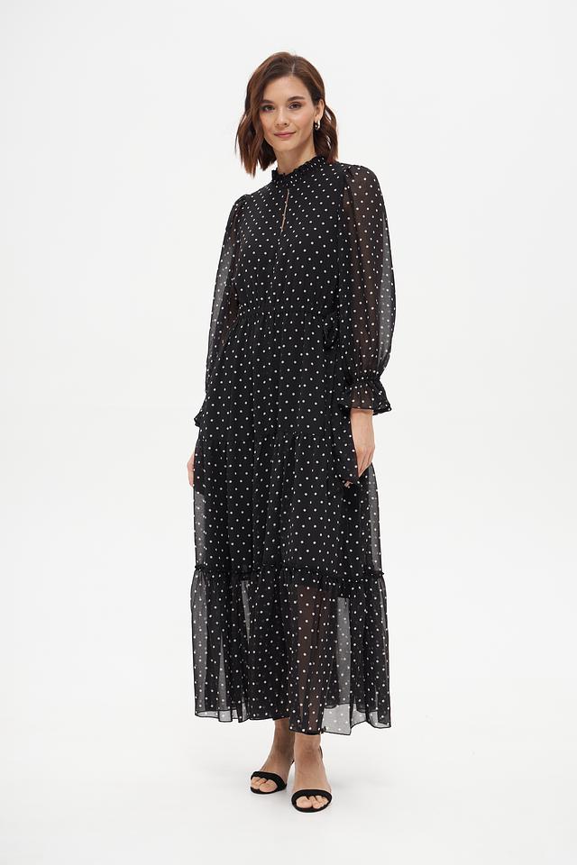 Платье от Oui чёрного цвета, украшенное белым горошком, выполнено из лёгкой полупрозрачной ткани. Модель с длинными рукавами и многоярусной юбкой создаёт романтичный и женственный образ. Состав: полиэстер 100%