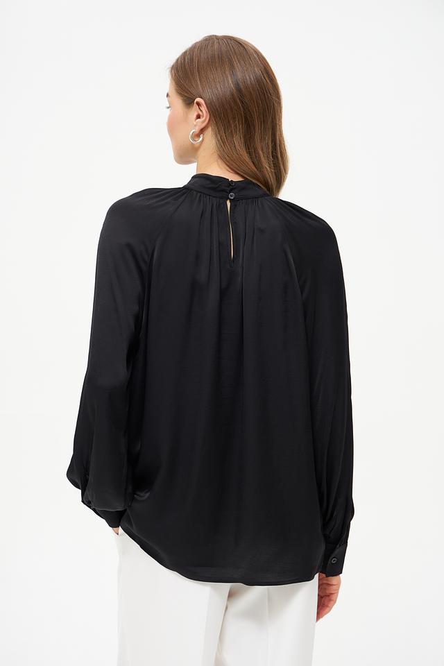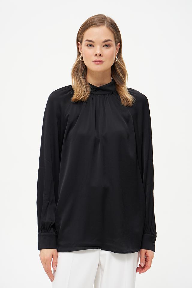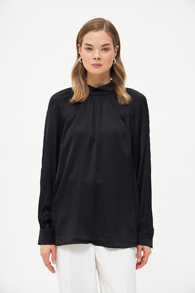 Блуза имеет классический чёрный цвет, который легко сочетается с различными элементами одежды. Воротник-стойка придает образу элегантность и изысканность. Длинные рукава с манжетами добавляют завершенности силуэту.