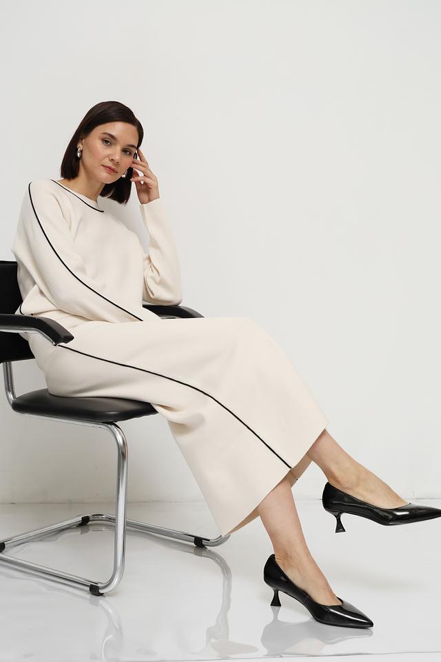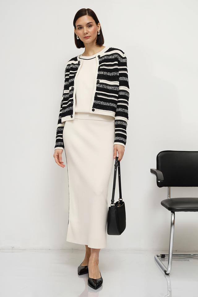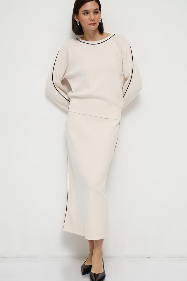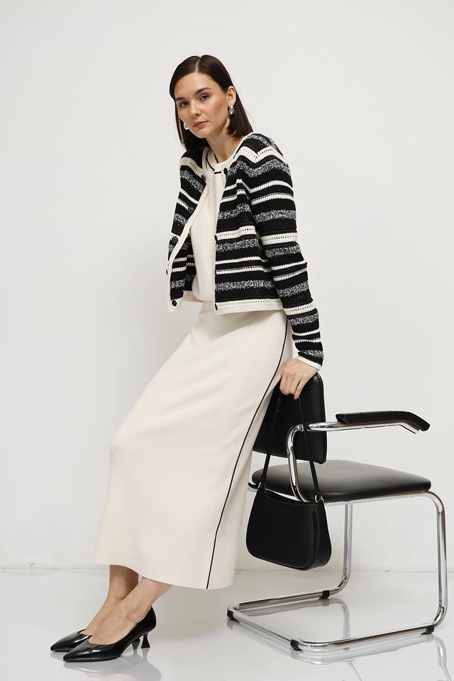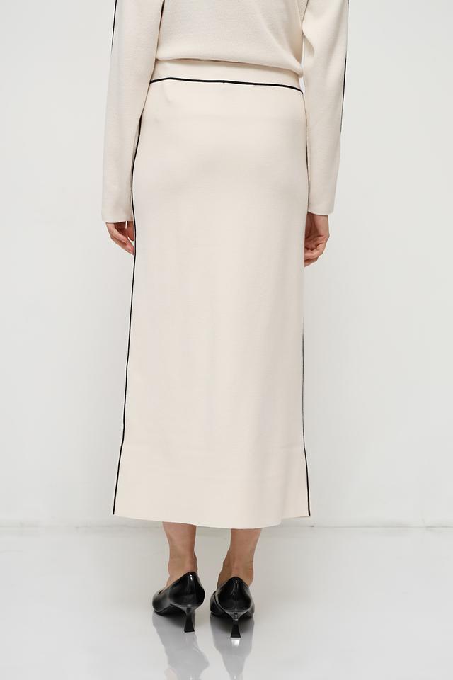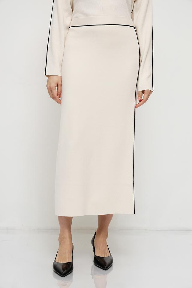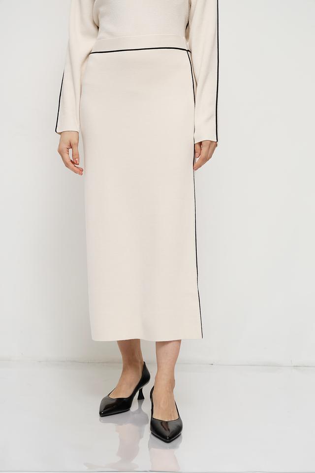 Юбка Oui миди бежевого цвета с контрастной чёрной полоской по бокам. Изготовлена из мягкой вискозы, полиамида и полиэстера, обеспечивающих комфорт и удобство в носке. Состав: вискоза 42%, полиамид 34%, полиэстер 24%