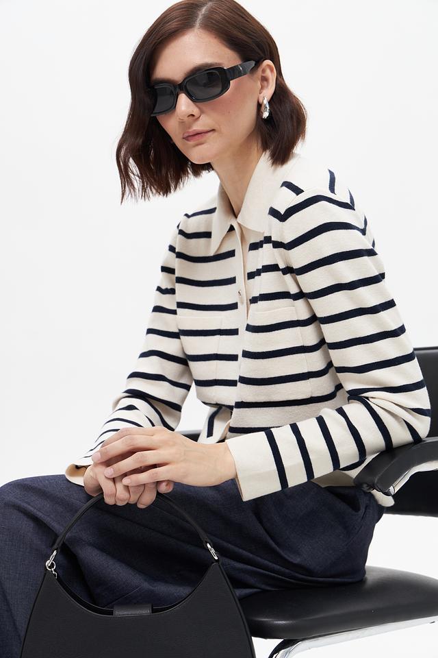 Этот стильный жакет от бренда Oui выполнен в классическом дизайне с полосатым узором. Преобладающий цвет – бежевый, с контрастными тёмно-синими полосами, создающими эффектный визуальный акцент.