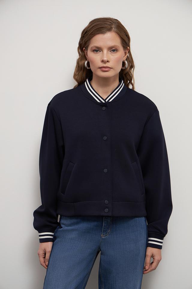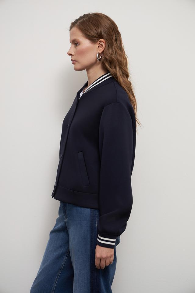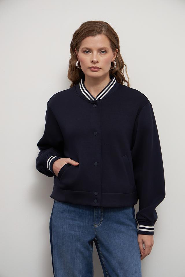Жакет имеет удобную посадку, воротник и манжеты отделаны контрастными белыми полосами, что придает ему спортивный и динамичный вид. Застежка выполнена на кнопки, что обеспечивает легкость и удобство в использовании.