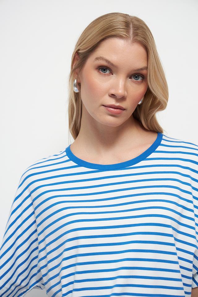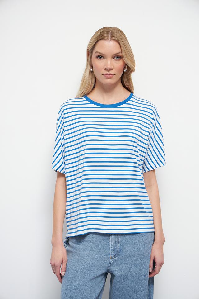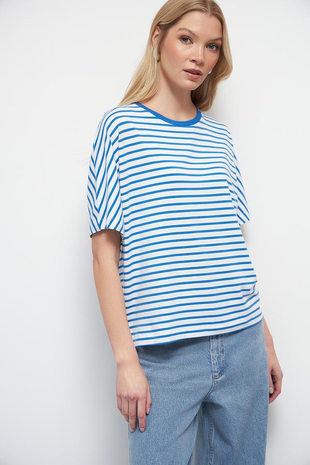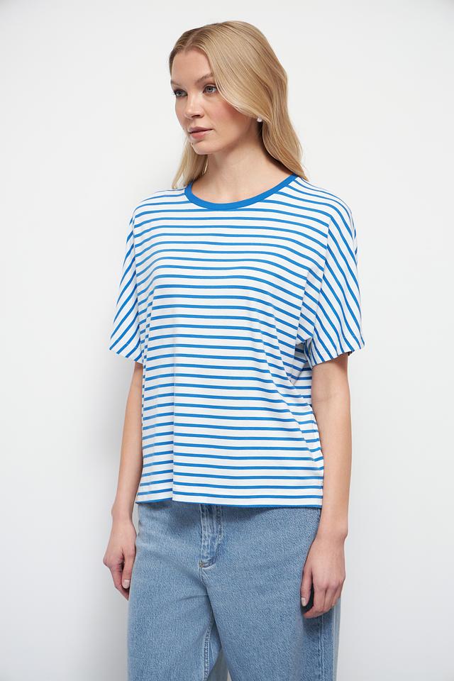Женская футболка Oui голубого и белого цвета в классическую полоску. Изготовлена из мягкого хлопка с добавлением модала и эластана для комфорта и хорошей посадки. Состав: хлопок 47%, модал 47%, эластан 6%