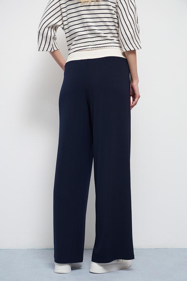 Брюки имеют удобный эластичный пояс с регулируемыми завязками, обеспечивающими идеальную посадку по фигуре. Крой клёш визуально удлиняет ноги и придает образу женственность.