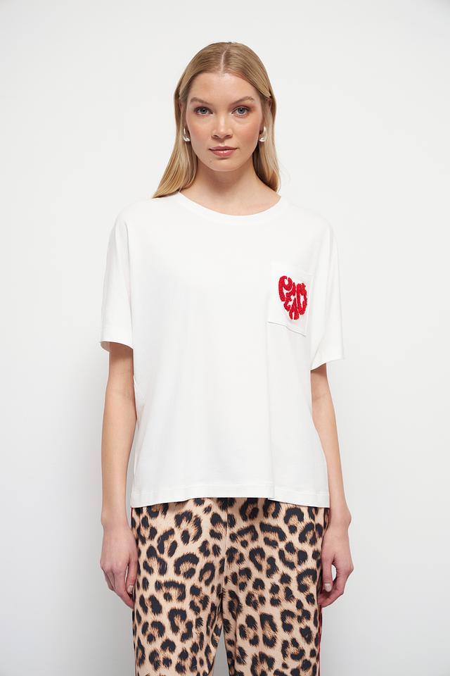 Особенностью этой модели является нагрудный карман, украшенный яркой вышивкой в форме сердца. Это придает футболке игривый и стильный вид. Прямой крой и короткие рукава делают ее универсальной для различных образов.