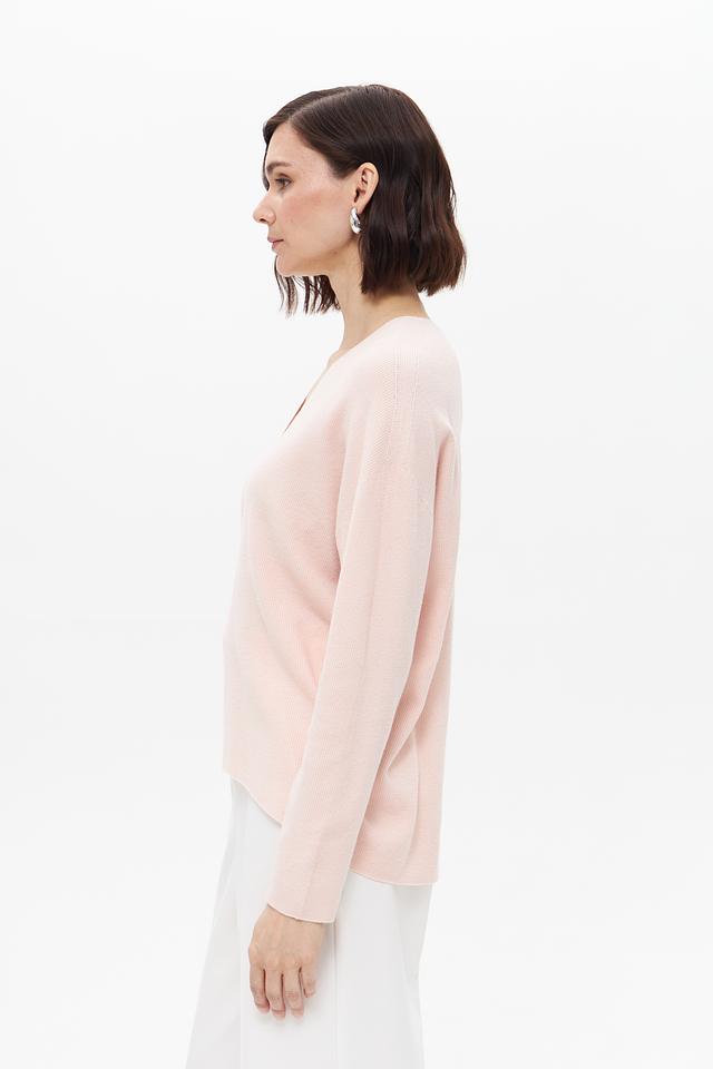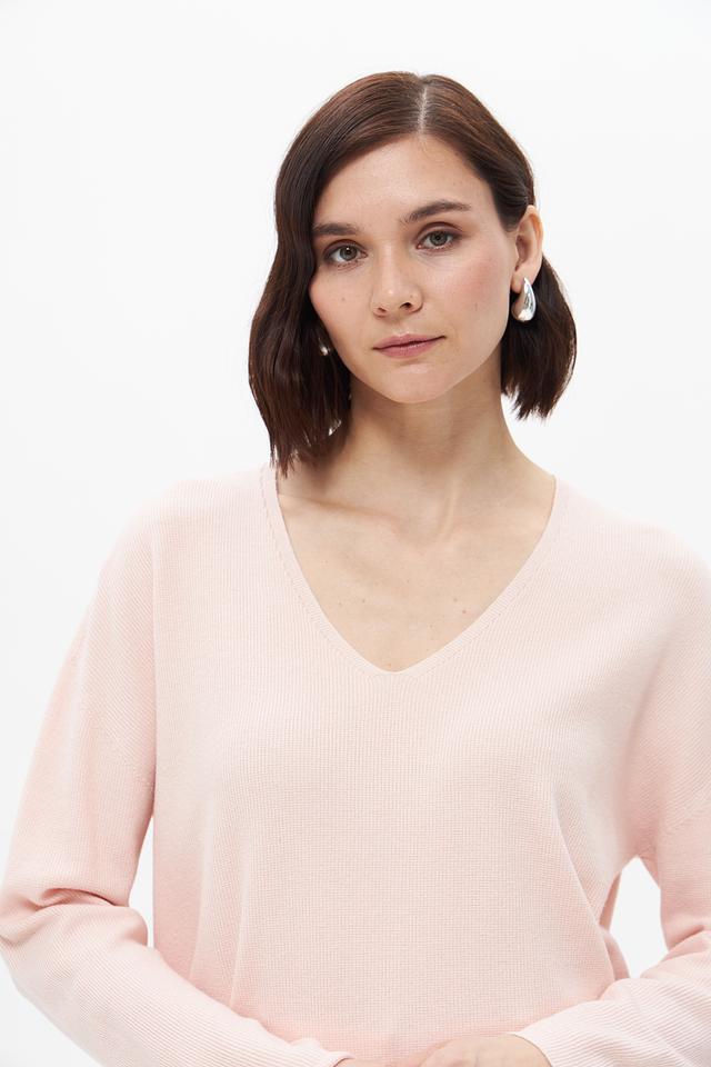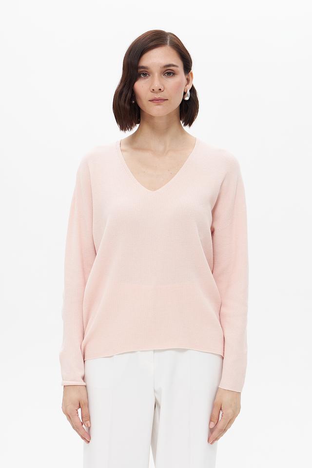 Женский пуловер Oui нежно-розового цвета с V-образным вырезом. Изготовлен из мягкой вискозы, полиэстера и полиамида, обеспечивающих комфорт и удобство в носке. Состав: вискоза 49%, полиэстер 28%, полиамид 23%