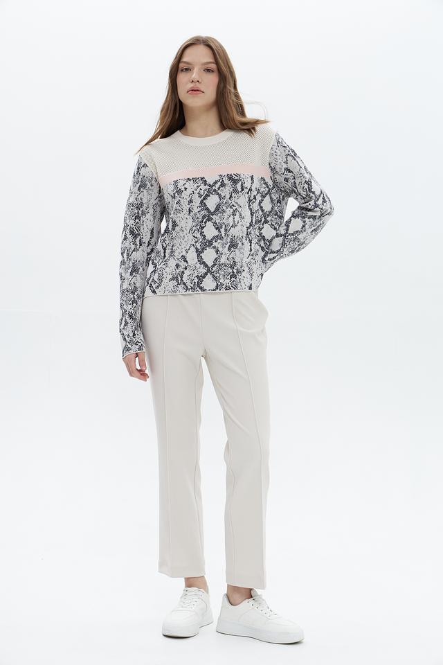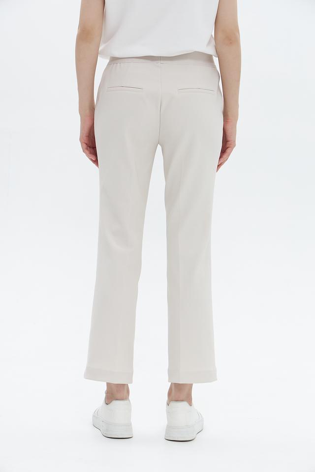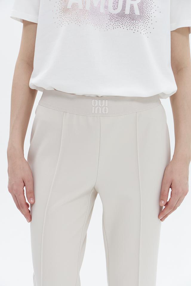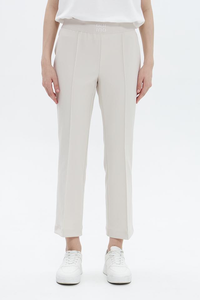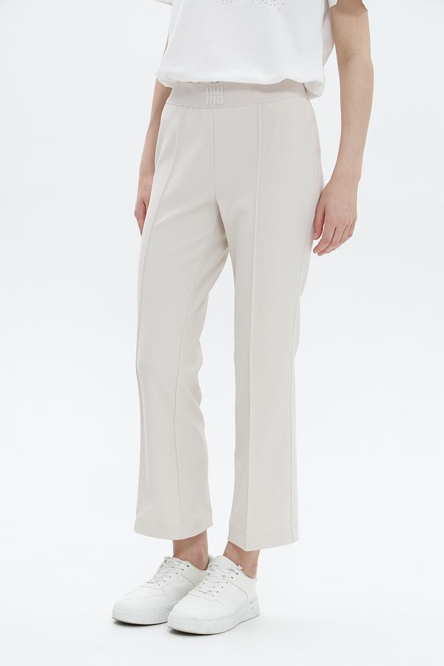 Брюки имеют прямой крой, слегка зауженные к низу, и классическую посадку на талии с эластичным поясом. Декоративные вертикальные вытачки визуально удлиняют ноги и придают силуэту стройность. Минималистичный дизайн делает эти брюки универсальными и подходящими для создания различных образов.