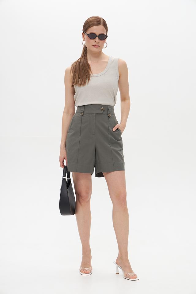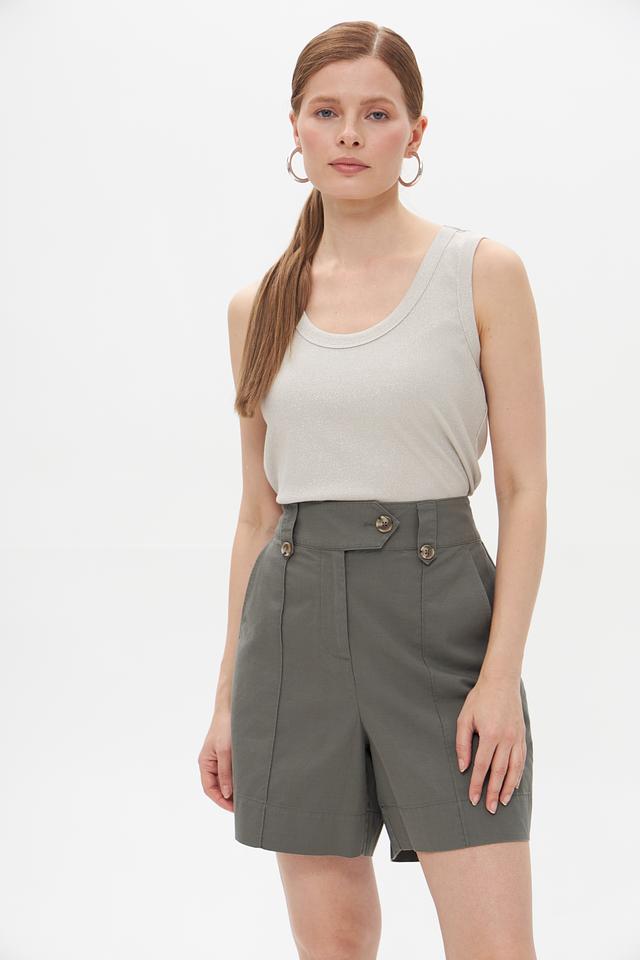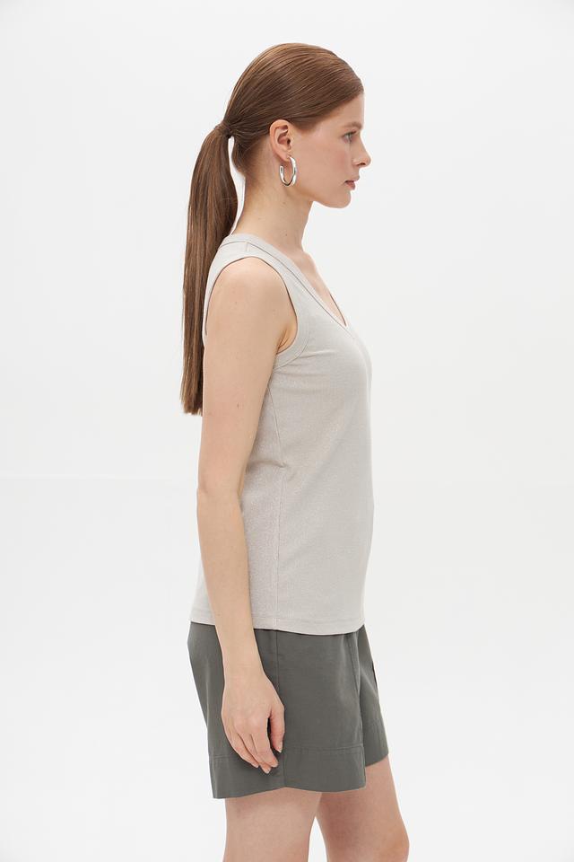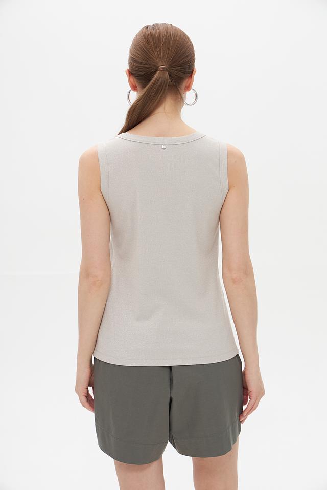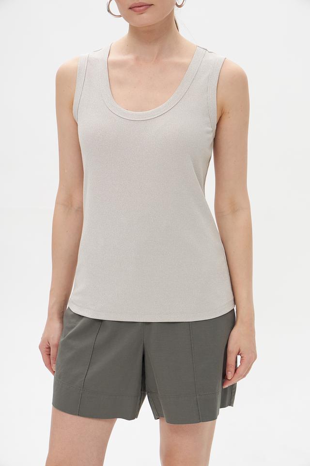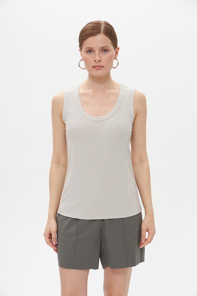 Топ имеет классический крой без рукавов и округлый вырез горловины. Благодаря нейтральному серому цвету, он легко сочетается с различными элементами одежды, позволяя создавать разнообразные образы.