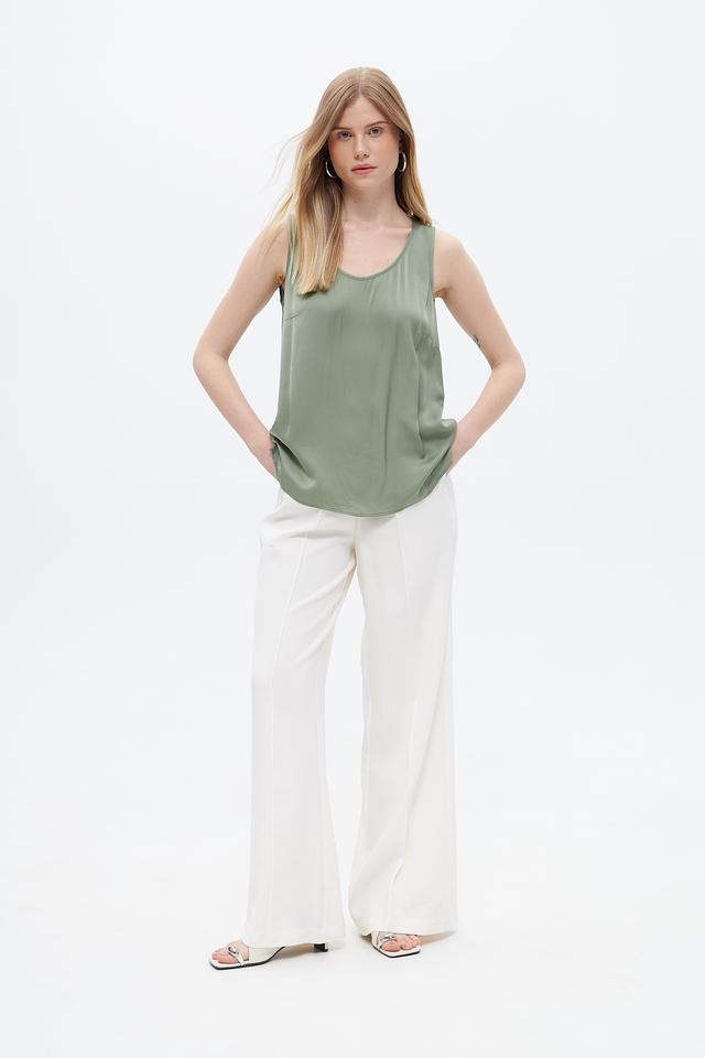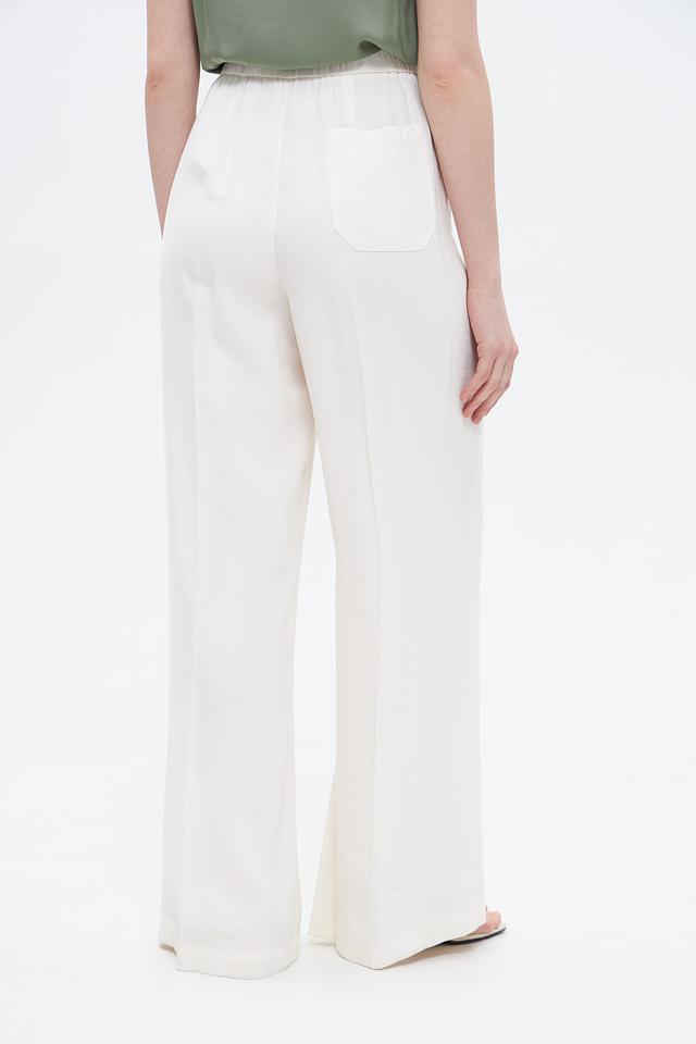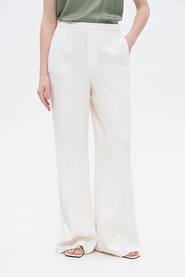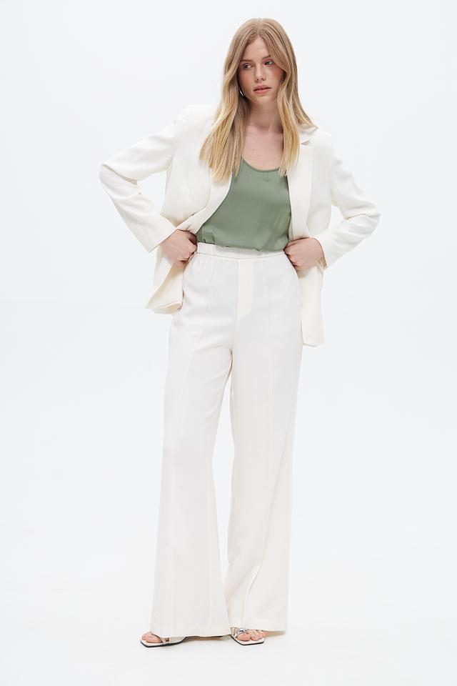 Брюки имеют классический молочный цвет, который легко сочетается с различными элементами одежды. Крой брюк клёш визуально удлиняет ноги и придает образу женственность.