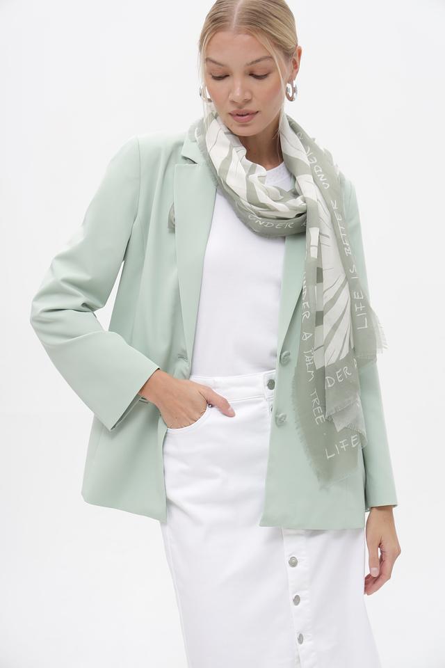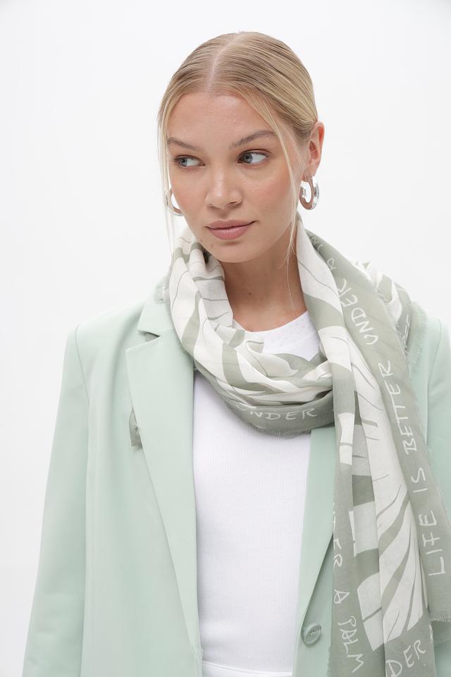 Изящный шарф от бренда Oui станет стильным дополнением к вашему образу. Шарф выполнен в нежном зелёном цвете и украшен оригинальным принтом, изображающим пальмовые листья и надписи.