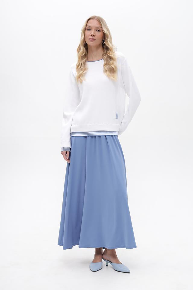 Особенностью модели является контрастная полоска на манжетах рукавов и по нижнему краю изделия, выполненная в голубых тонах. Также пуловер украшен небольшим квадратным патчем с полосатым рисунком на левой стороне. Круглый вырез горловины дополнен тонкой голубой окантовкой.