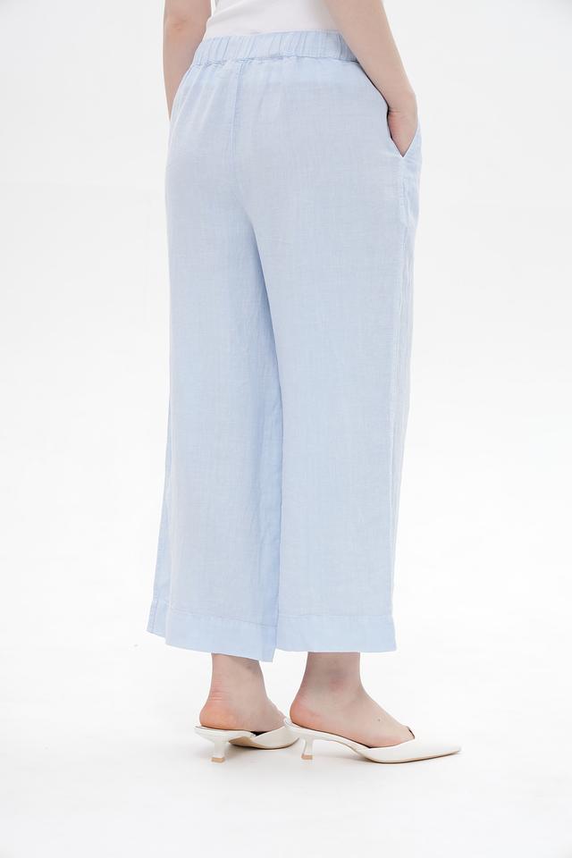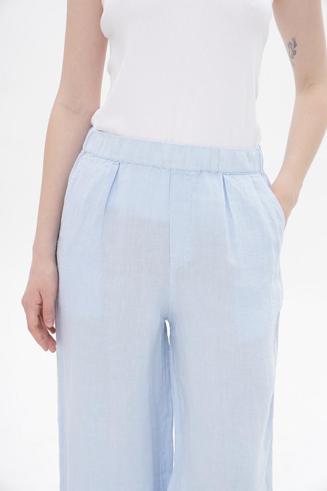 Женские брюки клёш от Oui голубого цвета, выполнены из 100% льна. Модель с эластичным поясом и боковыми карманами обеспечит комфорт в жаркую погоду. Состав: лен 100%