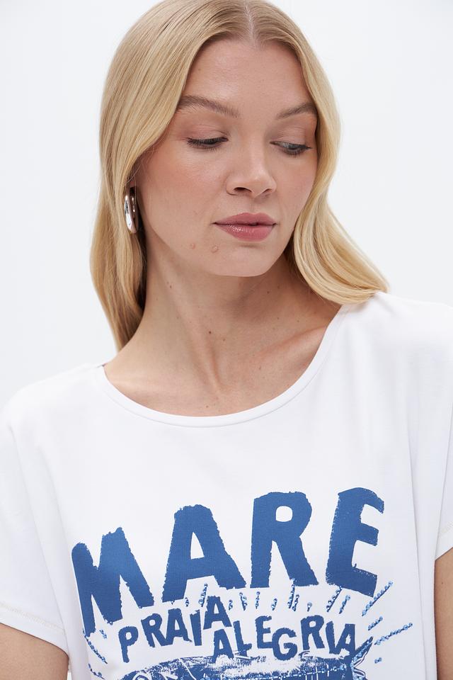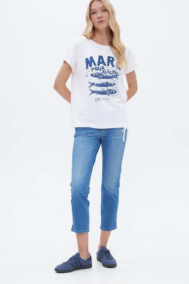 Футболка имеет прямой крой и короткие рукава. Главная особенность модели – яркий принт с морской тематикой, изображающий рыбок и надпись "Mare Praia Alegria". Принт выполнен в синих тонах, что создает контраст с белым фоном.