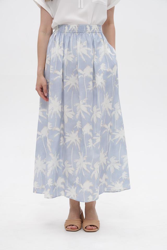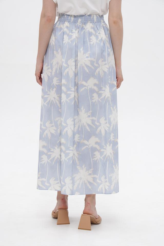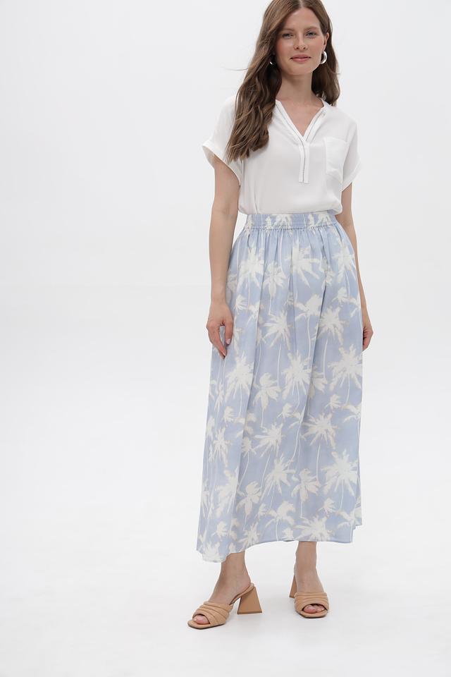 Эта юбка от бренда Oui станет прекрасным дополнением к вашему летнему гардеробу. Выполнена в нежном голубом цвете и украшена стильным принтом в виде пальмовых листьев. Модель имеет миди длину и свободный крой, что обеспечивает комфорт в носке.