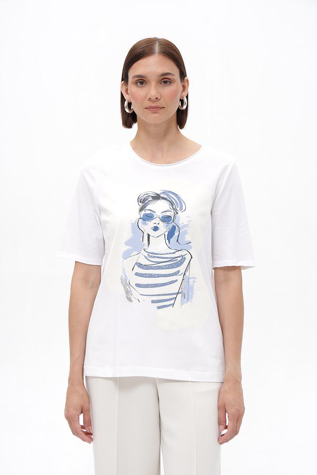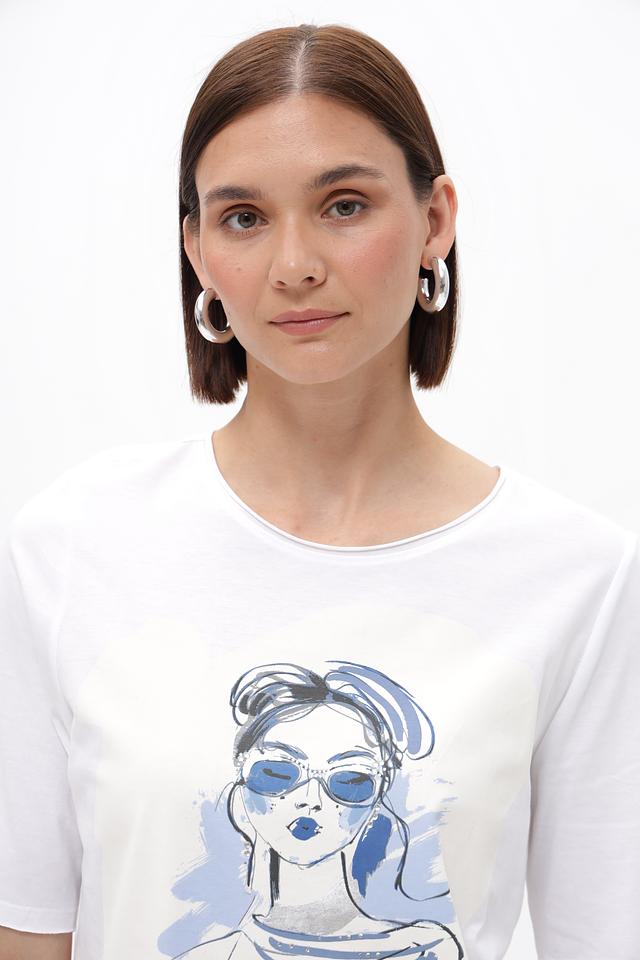 Особенностью данной модели является яркий и стильный принт с изображением девушки в берете и солнцезащитных очках, выполненный в голубых тонах. Этот принт добавляет футболке оригинальности и индивидуальности.