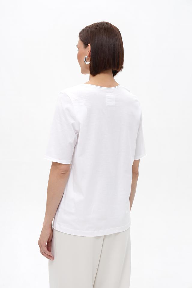 Футболка имеет прямой крой, короткие рукава и круглый вырез горловины. Она прекрасно сочетается с джинсами, брюками или юбками, позволяя создавать разнообразные образы. Благодаря своему универсальному дизайну, эта футболка подойдет для различных случаев – от повседневной носки до встреч с друзьями.