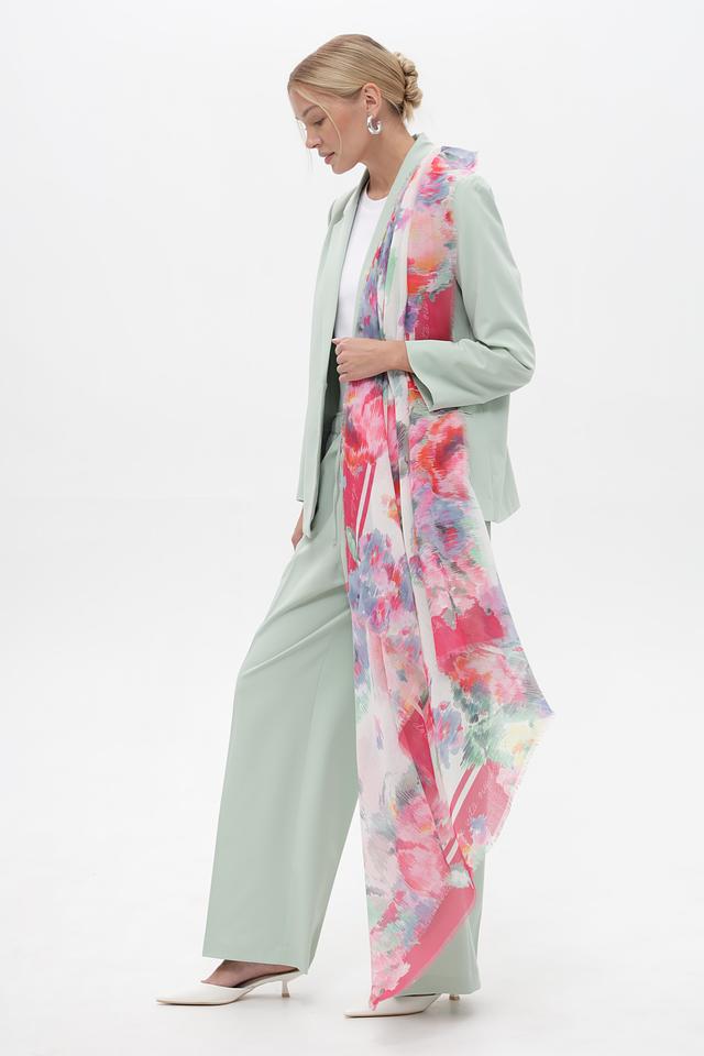 Дизайн шарфа представлен абстрактным цветочным принтом, сочетающим в себе оттенки розового, красного, голубого и зеленого. Такое сочетание цветов делает этот аксессуар универсальным и подходящим для различных стилей одежды.