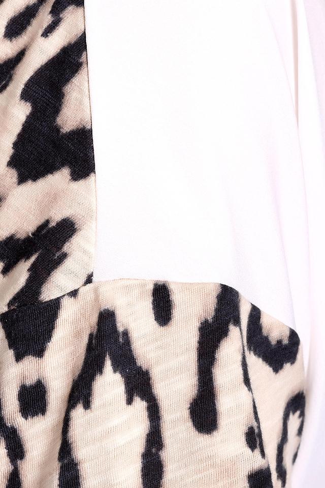 Рукава блузы выполнены в эффектном леопардовом принте, добавляя образу динамичности и оригинальности. На передней части блузы расположен яркий графический рисунок с изображением животных и растительных мотивов, выполненный в различных оттенках коричневого, розового и серого.