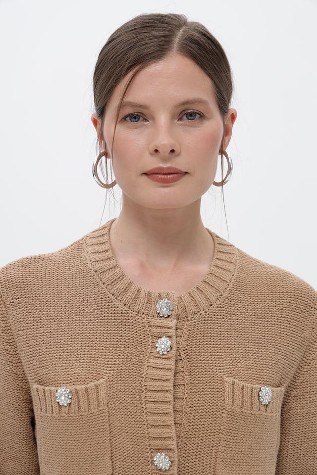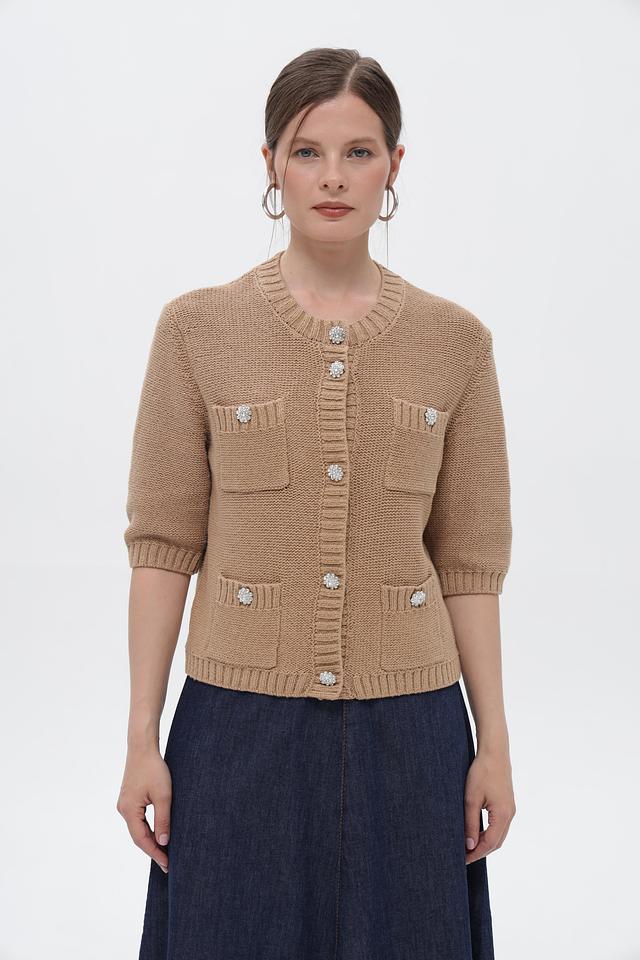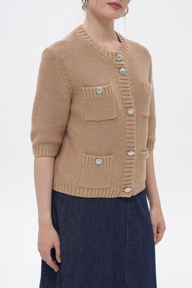 Жакет застегивается на ряд декоративных пуговиц, украшенных стразами, что придает изделию элегантный и изысканный вид. Два накладных кармана добавляют практичности и завершают дизайн.