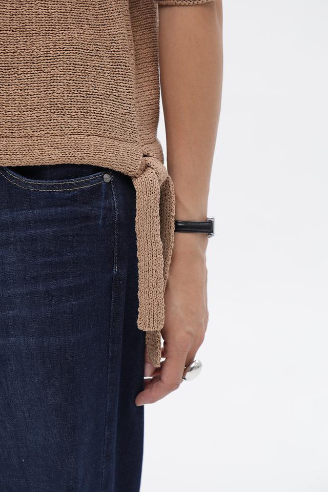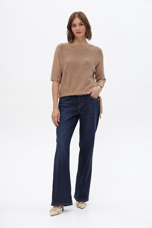 Пуловер имеет свободный крой, короткие рукава и округлый вырез горловины. Оригинальной деталью являются завязки по бокам, которые позволяют регулировать силуэт и создавать различные образы.