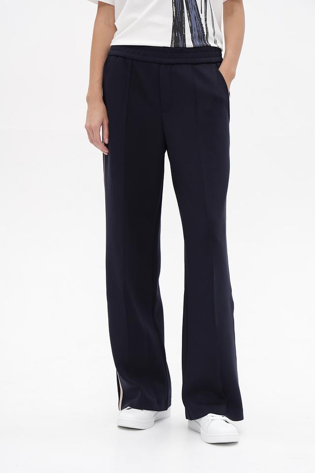 Стильные брюки клёш от Oui тёмно-синего цвета с контрастными полосками по бокам. Изготовлены из смеси полиэстера и вискозы с добавлением эластана для комфорта и свободы движений. Состав: полиэстер 49%, вискоза 46%, эластан 5%