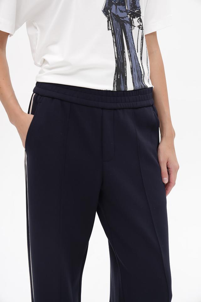 Представляем стильные брюки клёш от бренда Oui. Модель выполнена в тёмно-синем цвете и отличается лаконичным дизайном с контрастными полосками по бокам, добавляющими динамики образу.