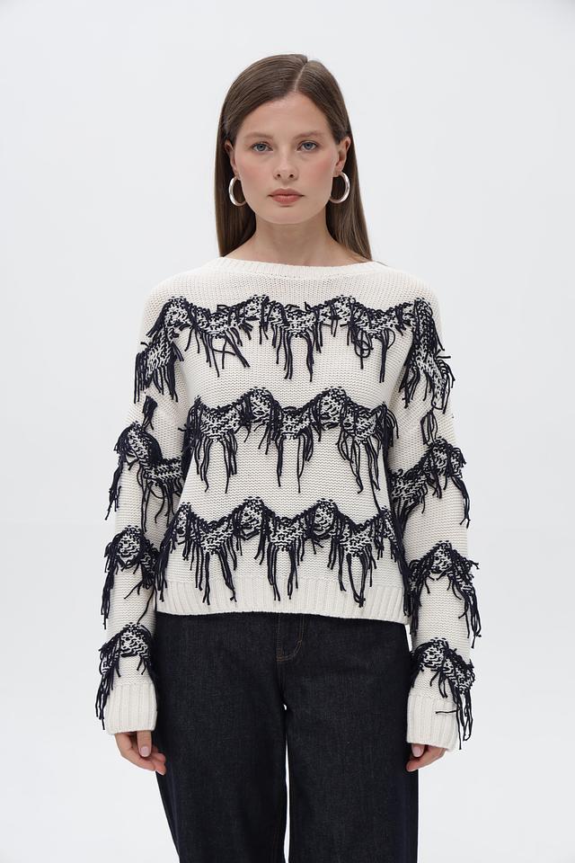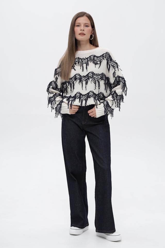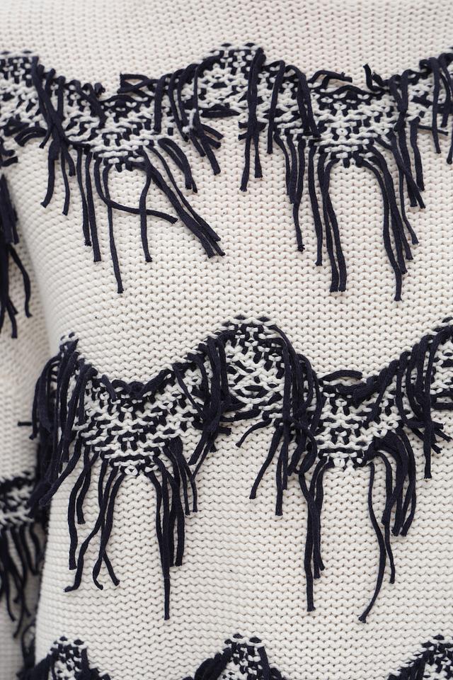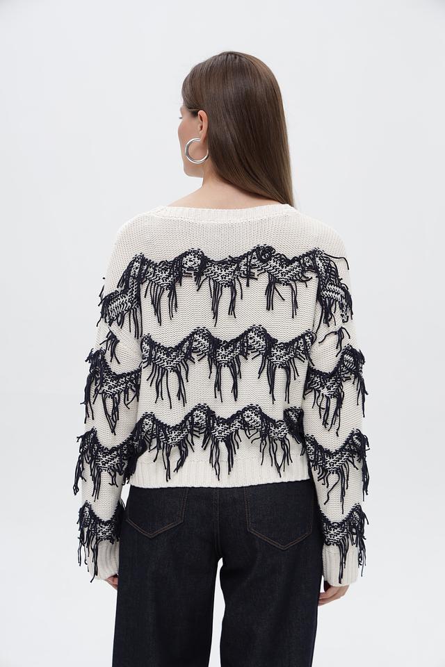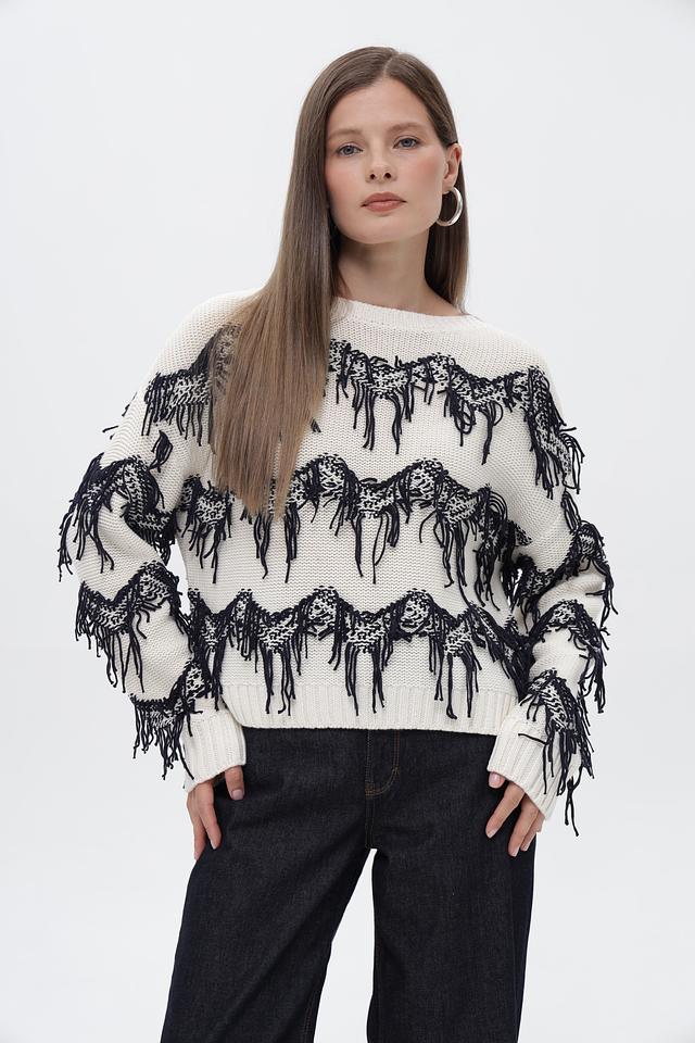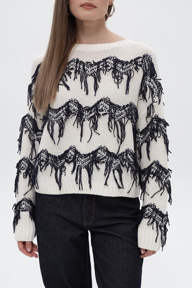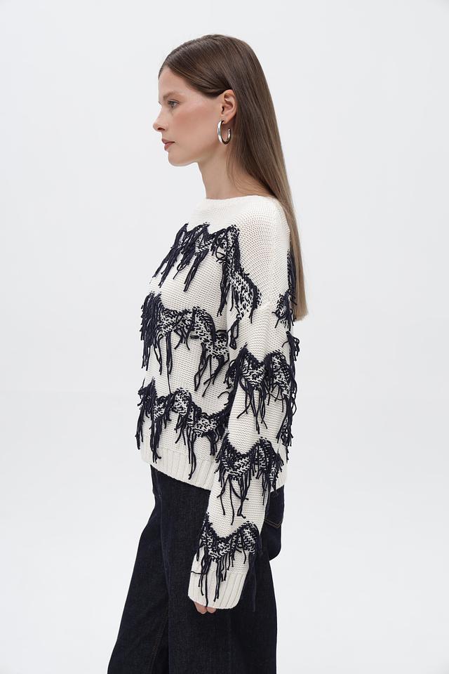 Особенности дизайна: пуловер украшен эффектным принтом, изображающим лошадей, выполненным в чёрном цвете. Дополнительным декоративным элементом служит бахрома, расположенная по контуру рисунка, придающая изделию оригинальность.