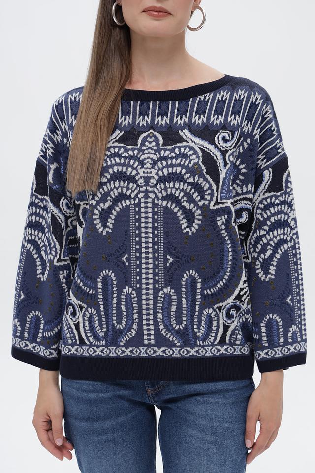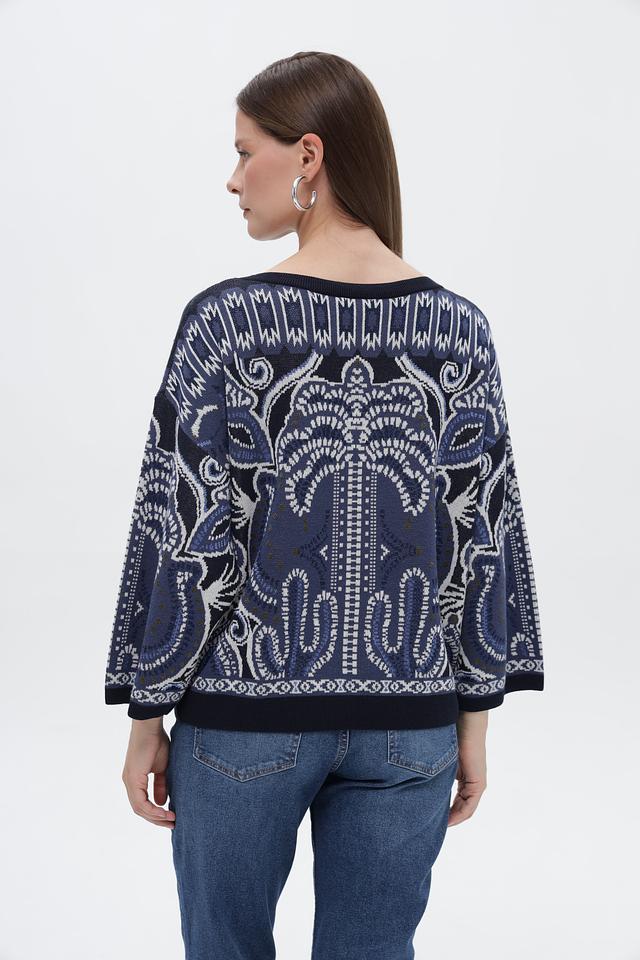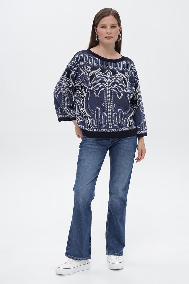 Синий пуловер Oui с оригинальным узором в виде орнамента. Изготовлен из мягкой смеси хлопка и вискозы, обеспечивающей комфорт и приятные ощущения при носке. Состав: хлопок 49%, вискоза 48%, полиамид 2%, полиэстер 1%