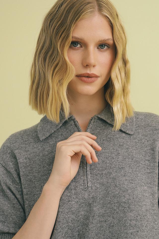 Пуловер имеет короткий рукав и воротник-поло с застежкой-молнией, что позволяет регулировать глубину выреза.