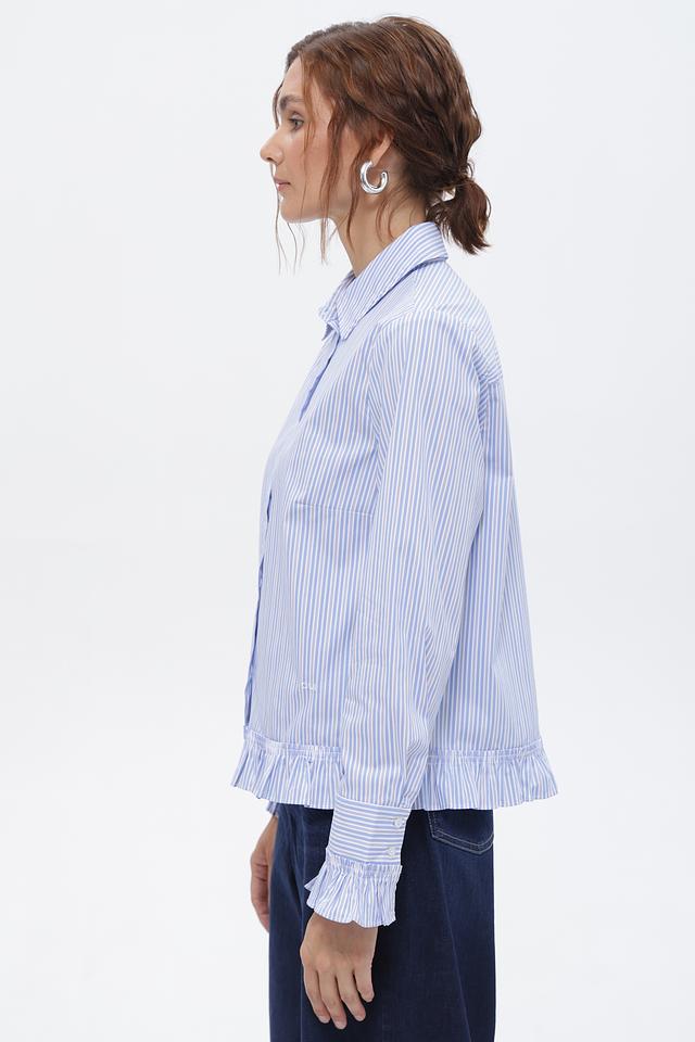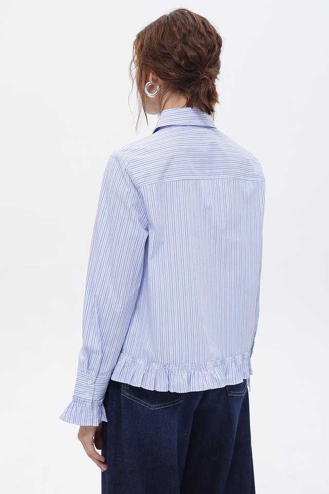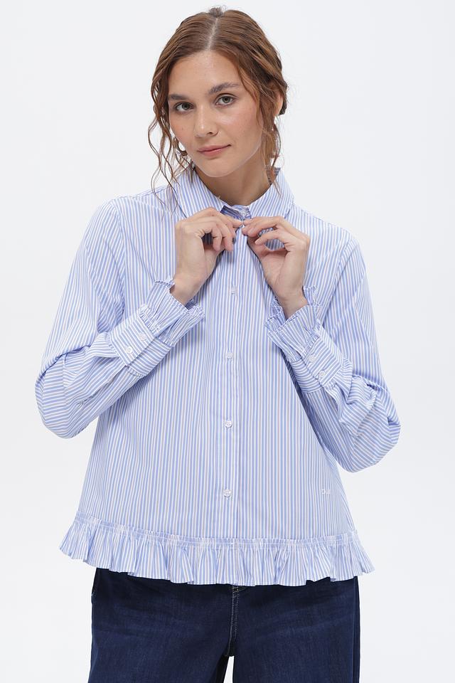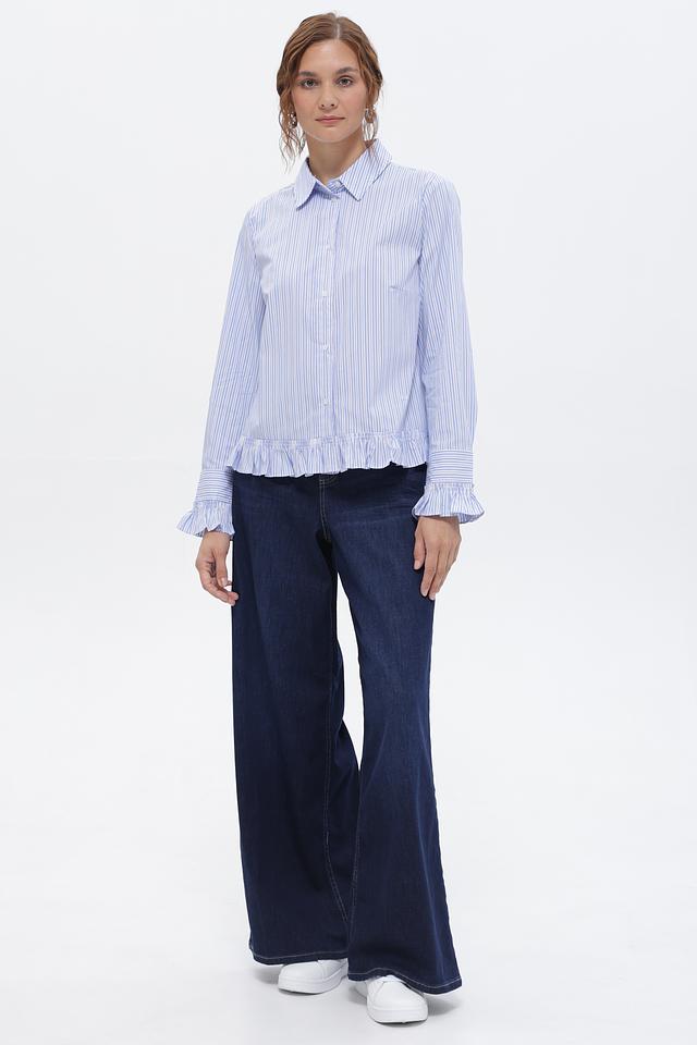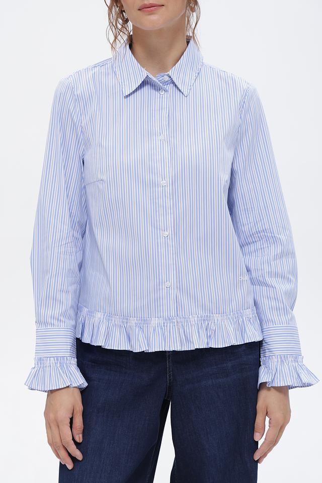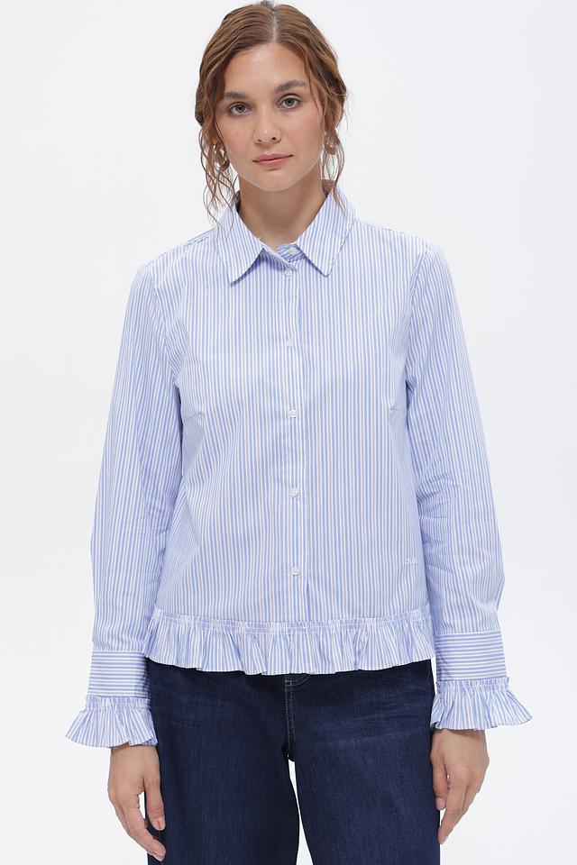 Голубая блуза Oui в вертикальную полоску с акцентными рюшами на манжетах и по низу. Изготовлена из приятного в носке хлопка с добавлением полиамида и эластана. Состав: хлопок 70%, полиамид 27%, эластан 3%