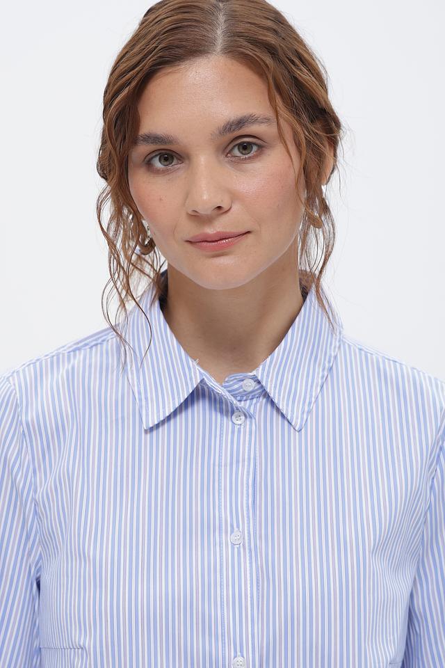 Классическая блуза от бренда Oui, выполненная в вертикальную полоску голубого и белого цветов. Модель имеет прямой крой, длинные рукава на манжетах и отложной воротник.