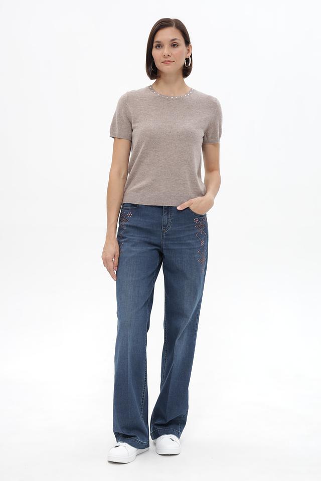 Пуловер имеет короткий рукав и круглый вырез горловины, украшенный рядом из искусственного жемчуга, что придает изделию изысканность и женственность. Приталенный силуэт подчеркнет достоинства фигуры.