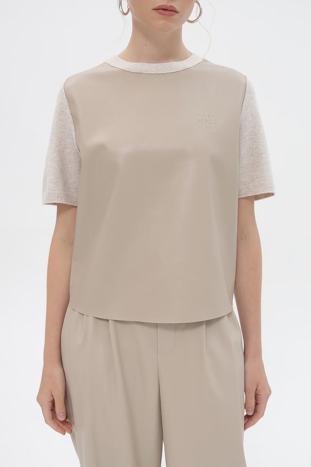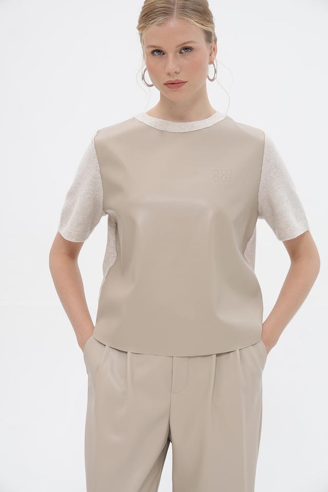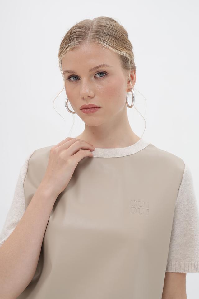 Передняя часть и верх рукавов выполнены из материала, напоминающего кожу, а задняя часть и нижняя часть рукавов – из вязаного трикотажа. На передней части пуловер украшен тисненым логотипом бренда Oui. Круглый вырез горловины и короткие рукава делают этот пуловер идеальным для теплой погоды.