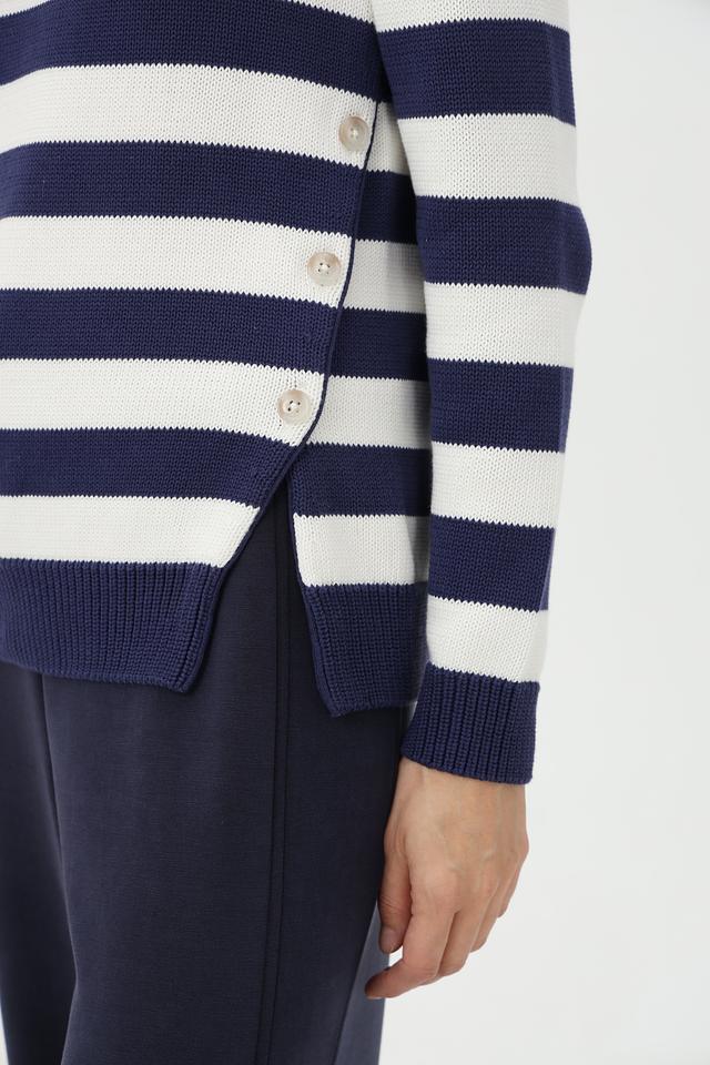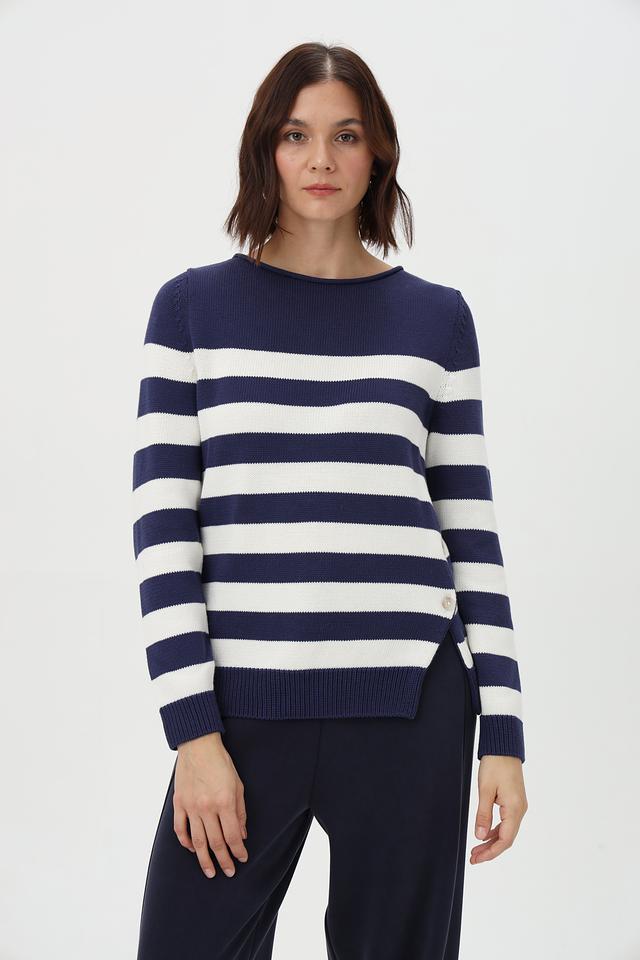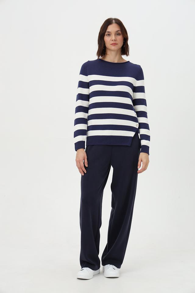 Этот пуловер от бренда Oui – прекрасный выбор для создания повседневного образа. Модель выполнена в классическом стиле с горизонтальной полоской синего и белого цветов.