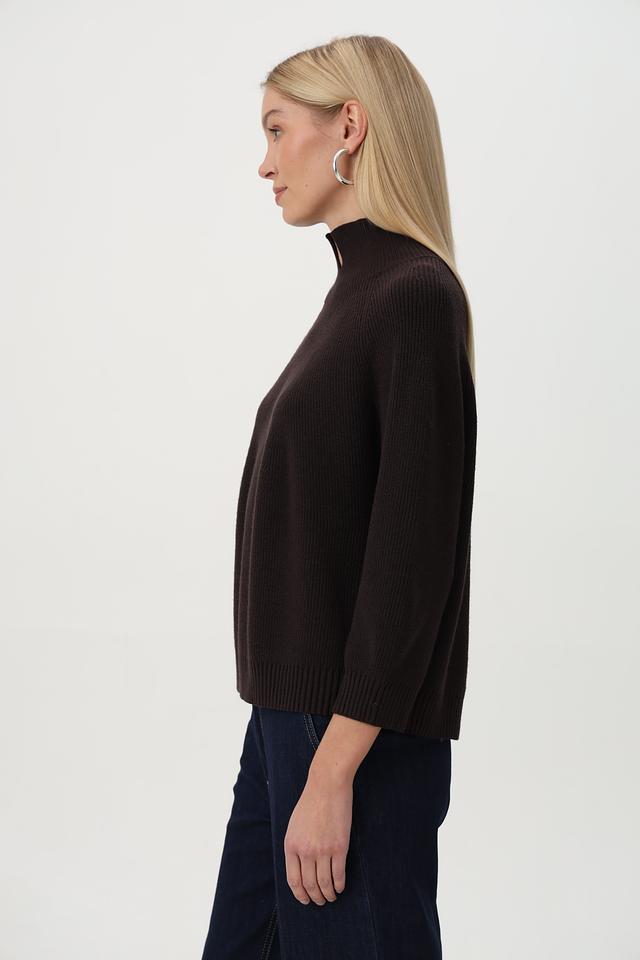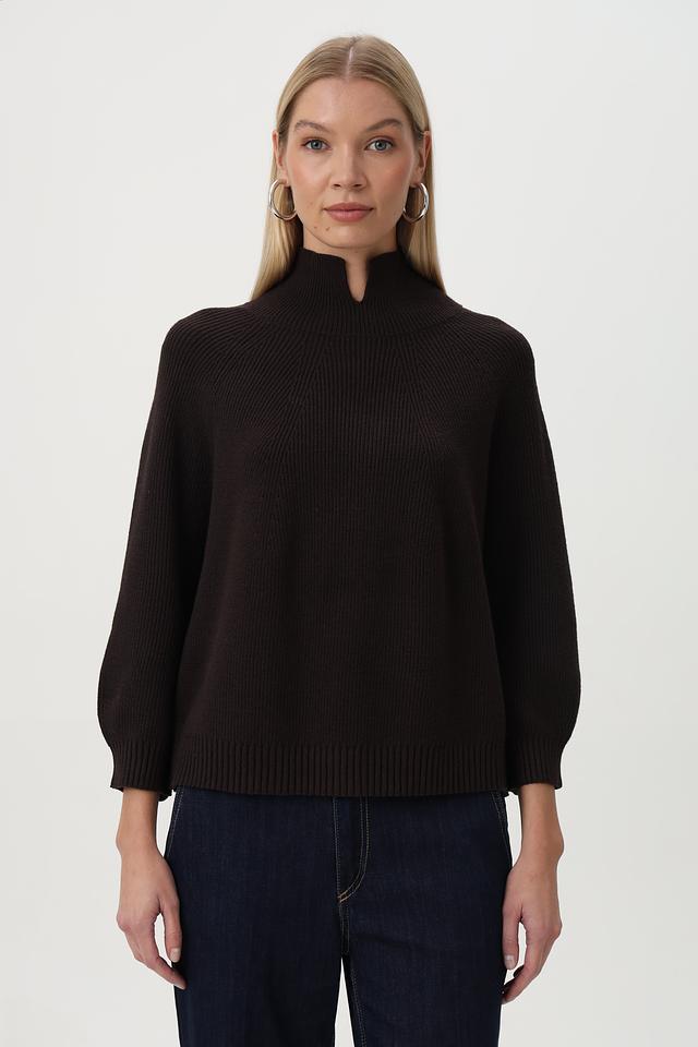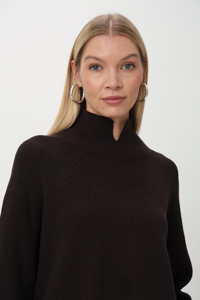 Темно-коричневый пуловер Oui с оригинальным воротником-стойкой. Выполнен из мягкой смеси вискозы, полиэстера и полиамида. Умеренный объём и рукава 3/4. Состав: вискоза 50%, полиэстер 28%, полиамид 22%
