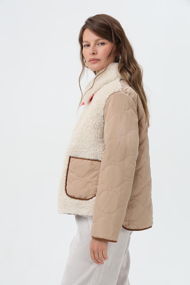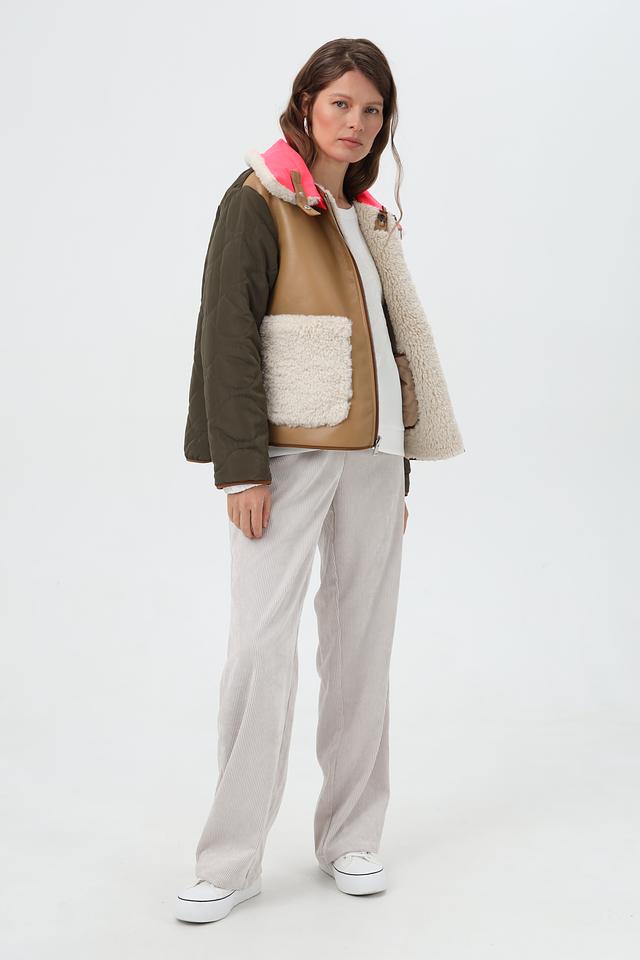 Эта стильная куртка от Oui станет ярким акцентом вашего образа. Куртка выполнена в комбинированной технике, сочетающей в себе бежевую экокожу, мягкий искусственный мех и стеганую ткань хаки. Благодаря такому сочетанию материалов куртка выглядит современно и интересно.