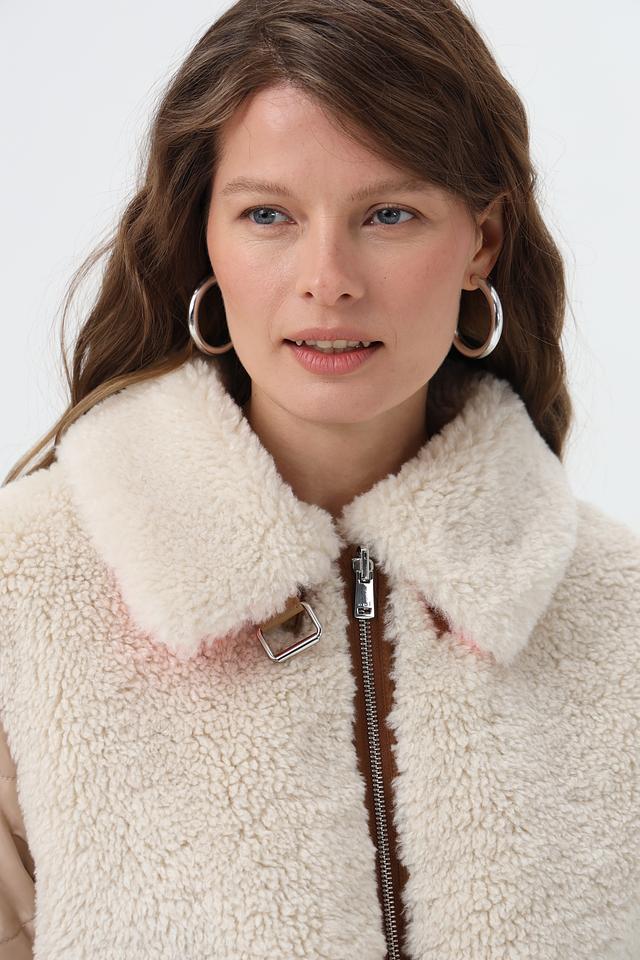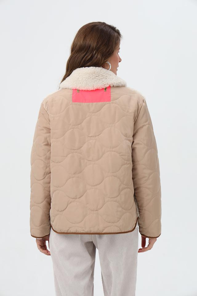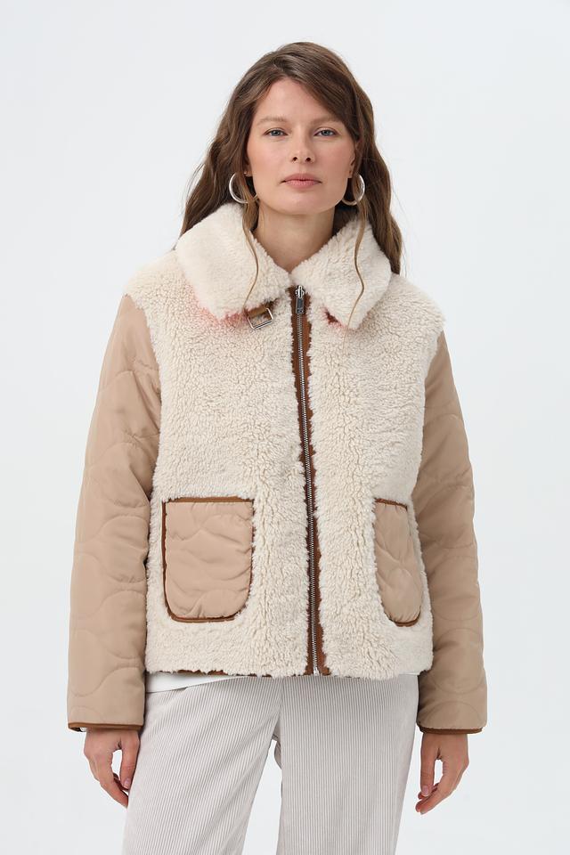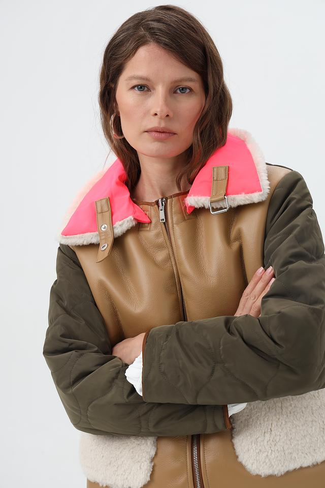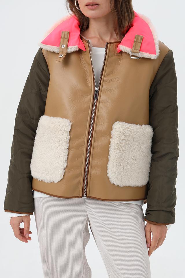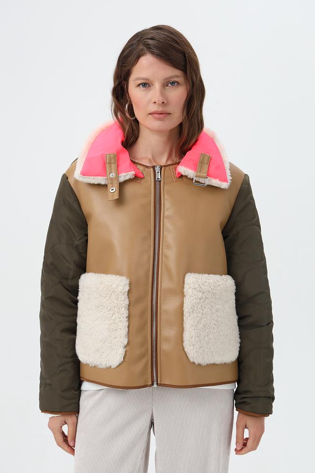Женская куртка Oui бежевого цвета с контрастными вставками из экокожи, меха и стеганой ткани. Модель имеет оригинальный дизайн с ярким розовым воротником и удобную застежку на молнию. Состав: полиэстер 100%