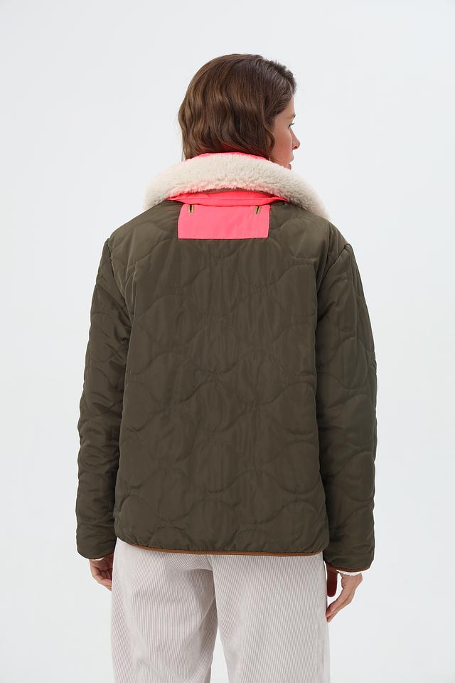 Модель имеет удобную застежку на молнию, высокий воротник и оригинальный розовый отложной воротник из гладкой ткани. Куртка дополнена двумя накладными карманами с меховыми вставками. Рукава куртки выполнены из стеганой ткани, что придает ей дополнительный объем и текстуру.