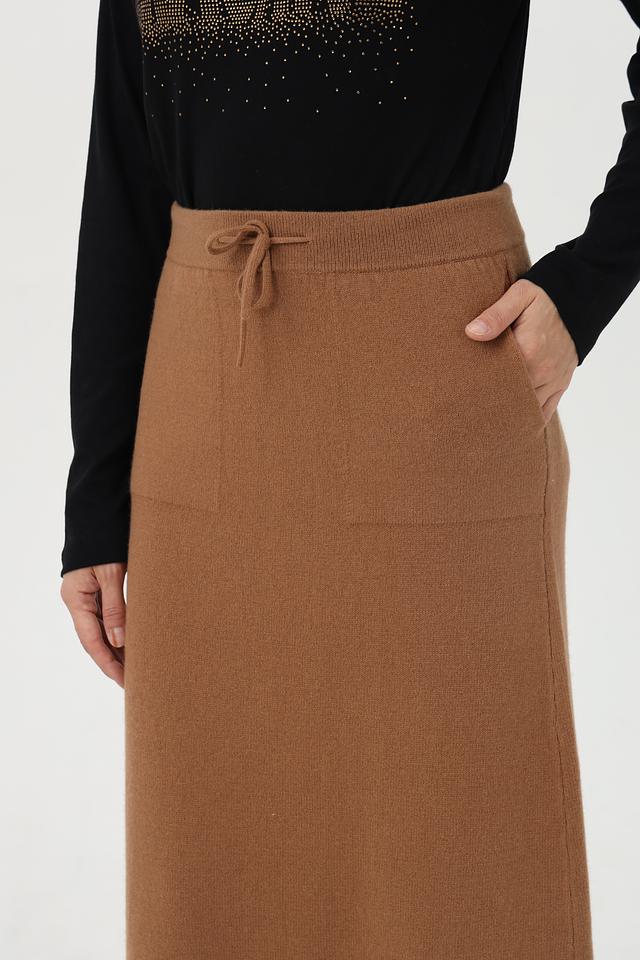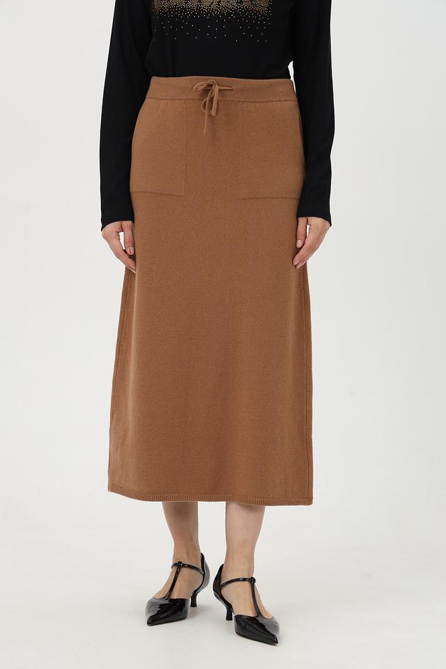Коричневая вязаная юбка от Oui длиной миди. Изделие выполнено из смесовой шерсти, модала и полиамида, имеет эластичный пояс с кулиской и боковые карманы. Состав: шерсть 47%, полиамид 33%, модал 19%, эластан 1%