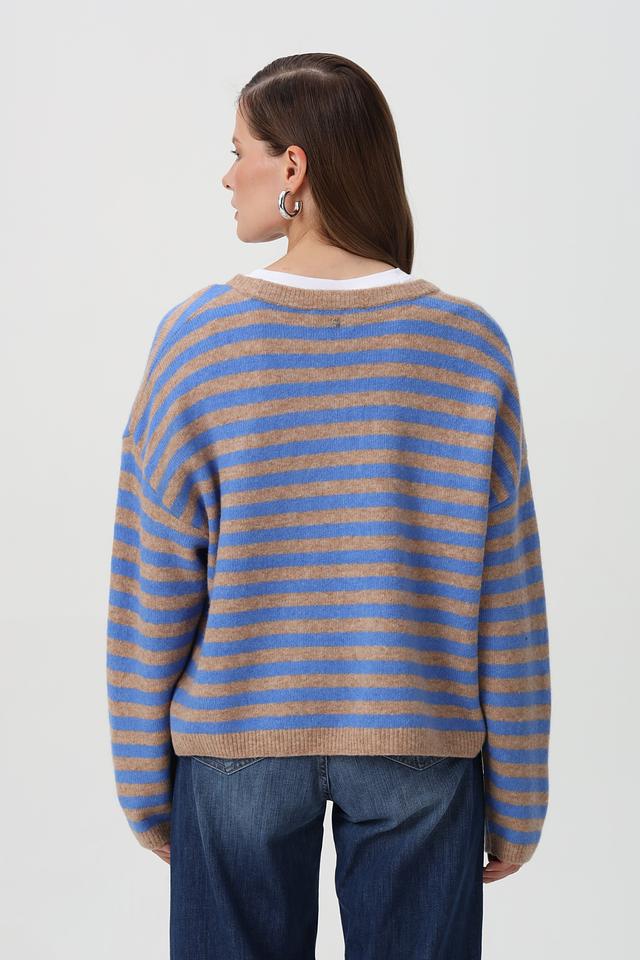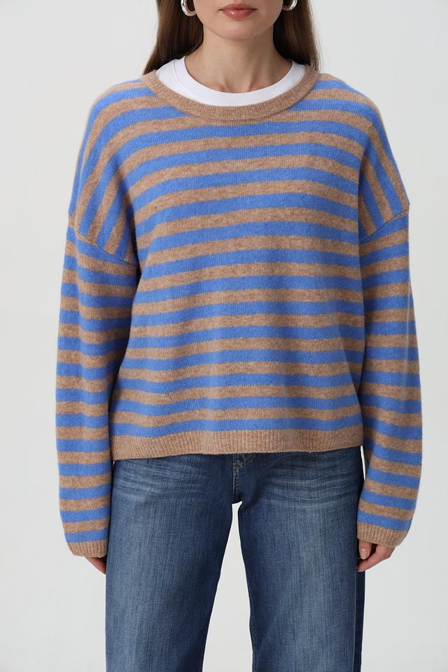Изделие выполнено в горизонтальную полоску, сочетающую голубой и бежевый цвета, что придает ему свежий и современный вид.