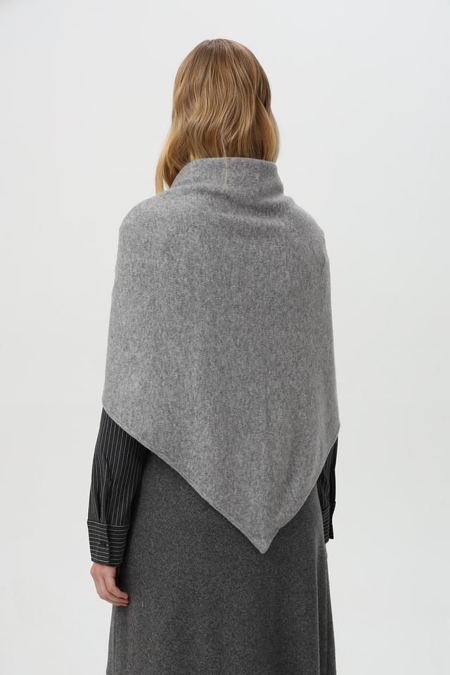 Шарф имеет форму равностороннего треугольника, благодаря чему его можно носить разными способами, создавая разнообразные образы. На фотографии шарф завязан узлом, что добавляет образу оригинальности.