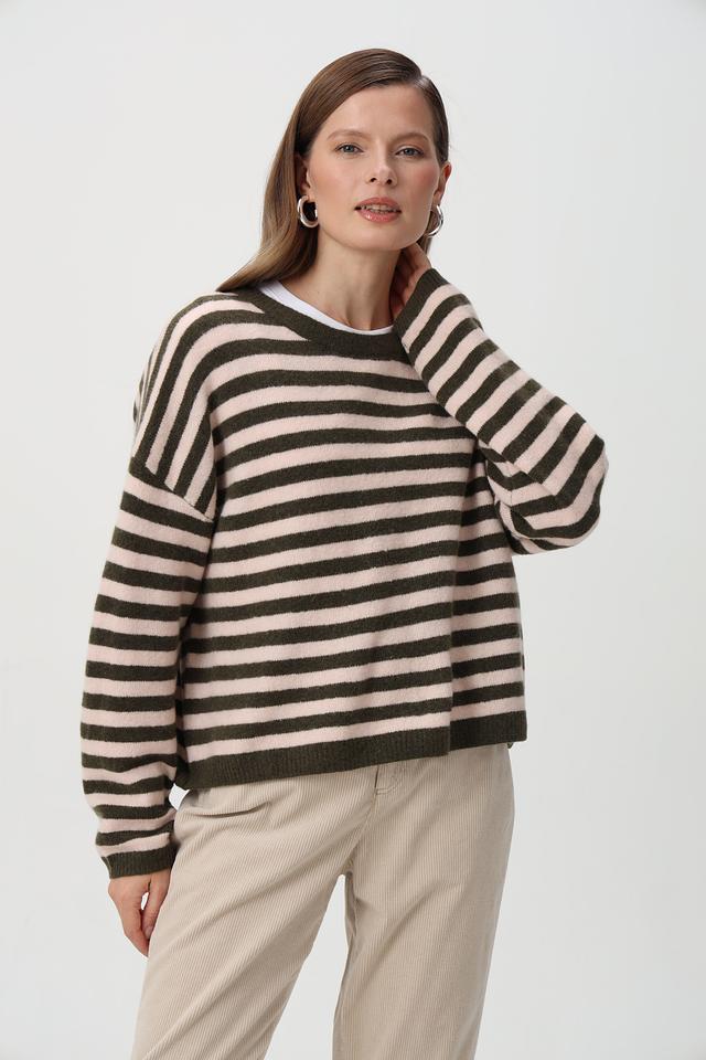 Женский пуловер Oui зеленого и бежевого цвета в классическую полоску. Изготовлен из мягкой шерсти с добавлением полиамида и других синтетических волокон для комфорта и долговечности. Состав: полиамид 44%, шерсть 32%, полиэстер 21%, эластан 3%