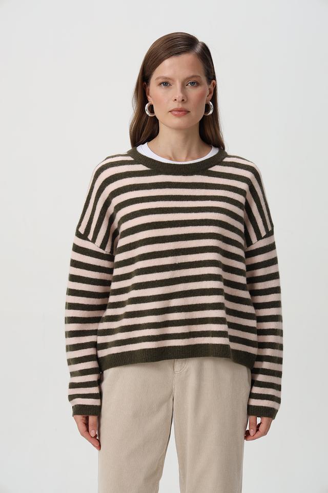 Женский пуловер от бренда Oui выполнен в актуальной полосатой расцветке, сочетающей оттенки зеленого и бежевого. Модель имеет круглый вырез горловины и длинные рукава.