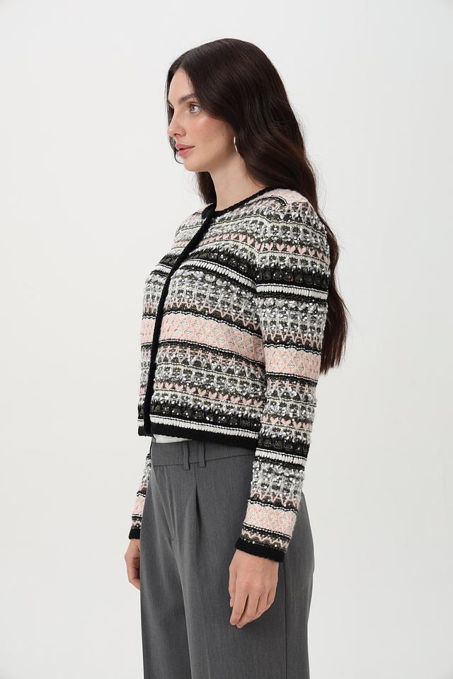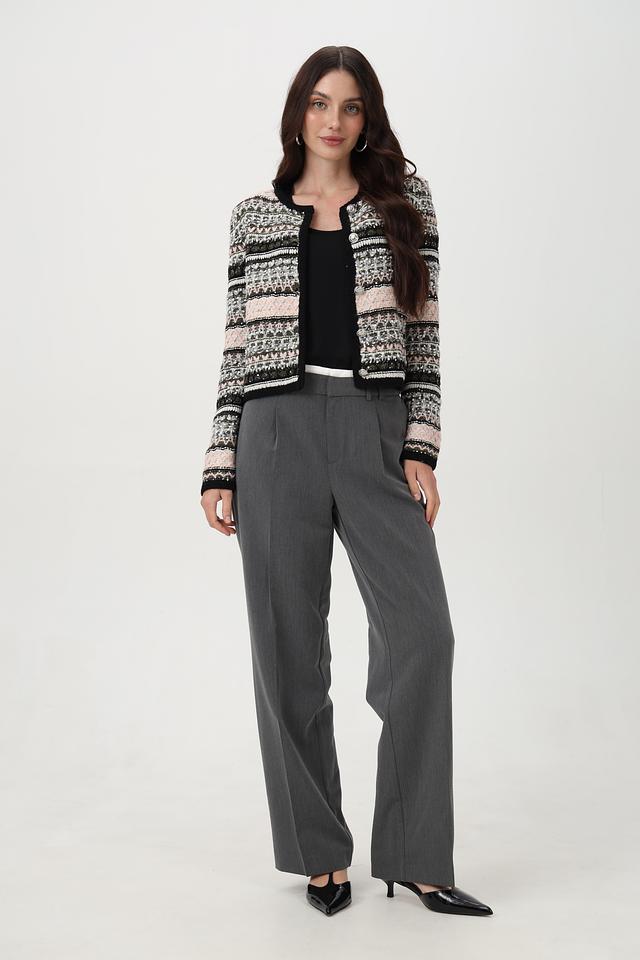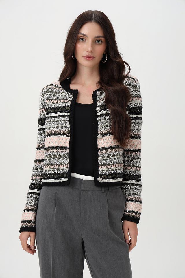 Женский жакет от бренда Oui, выполненный в светлой цветовой гамме с выразительным геометрическим узором. Модель имеет укороченный крой и длинные рукава.