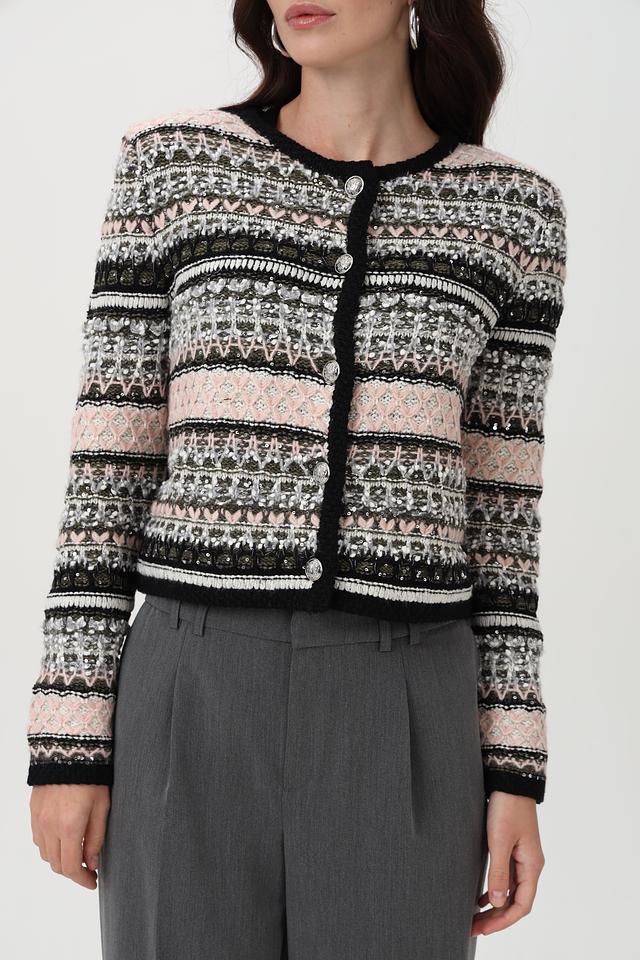 Жакет застегивается на несколько пуговиц, что позволяет регулировать степень прилегания. Изделие выполнено из смесового материала, в состав которого входят хлопок, полиамид, полиэстер, полиакрил и небольшое количество шерсти.