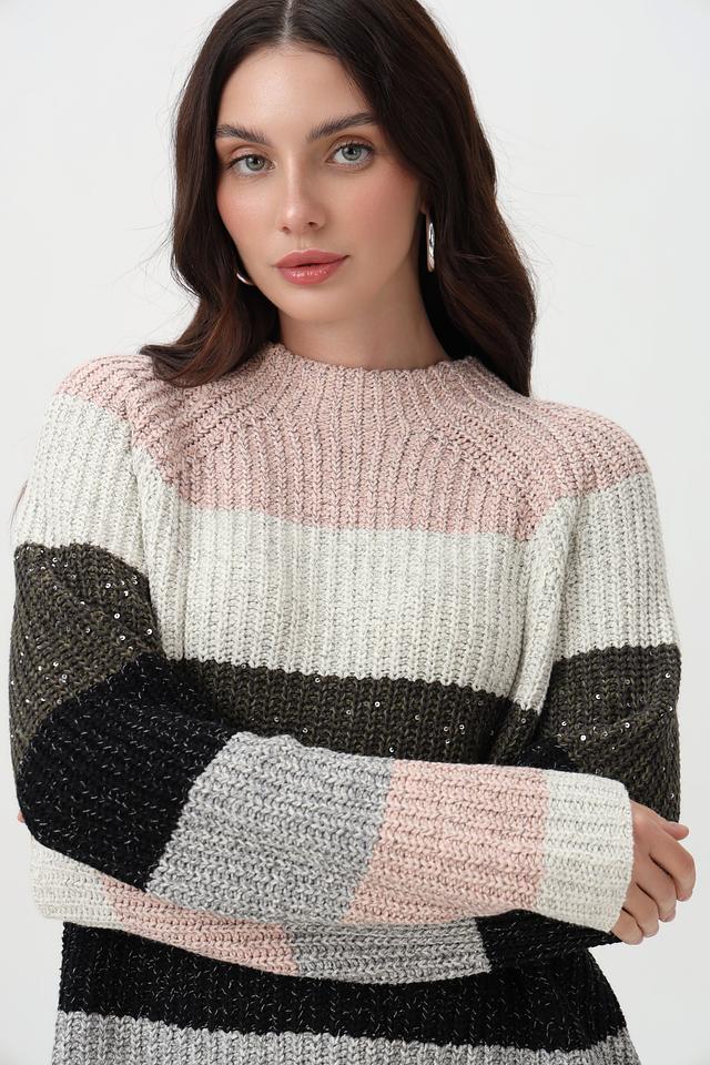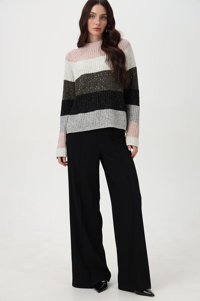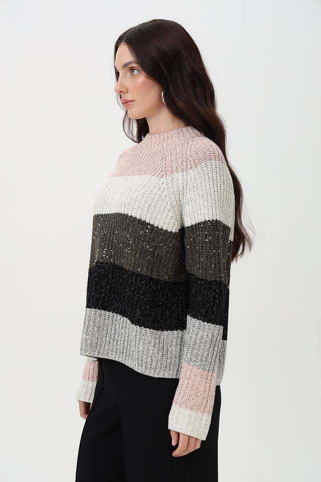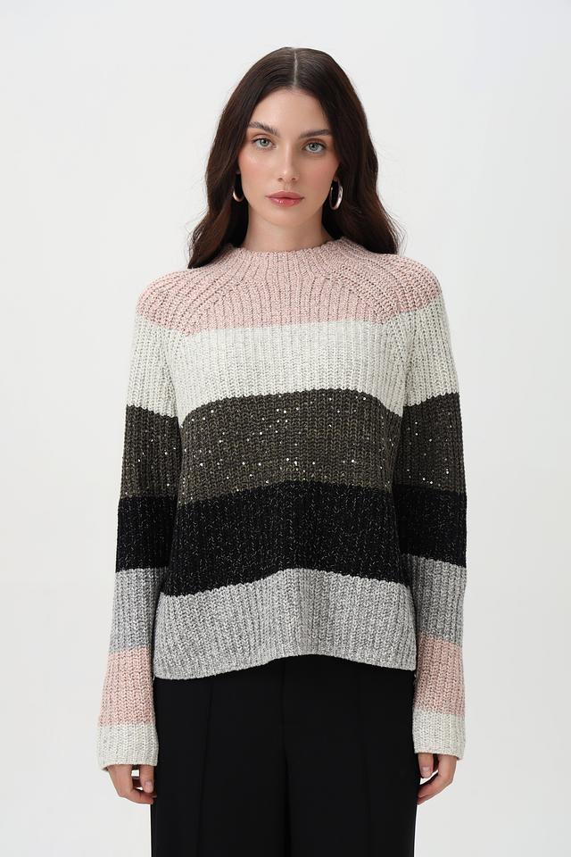 Пуловер имеет круглый вырез и длинные рукава, обеспечивающие комфортную посадку. На полосах деликатно вплетены пайетки, придающие изделию лёгкое мерцание и праздничный вид. Свободный крой не сковывает движений и позволяет создать расслабленный образ.