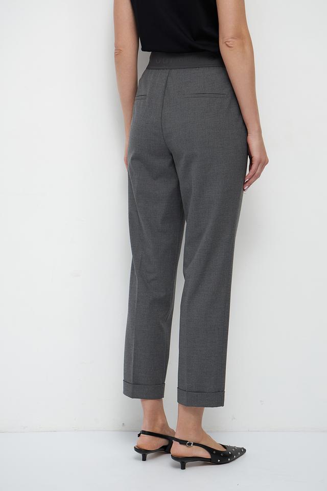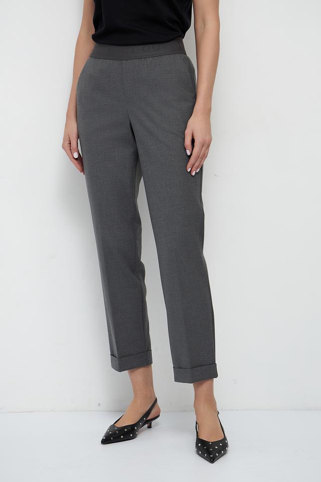Брюки имеют прямой крой и слегка зауженный силуэт к низу. Эластичный пояс обеспечивает идеальную посадку по фигуре, а манжеты внизу добавляют образу непринужденности и стиля.